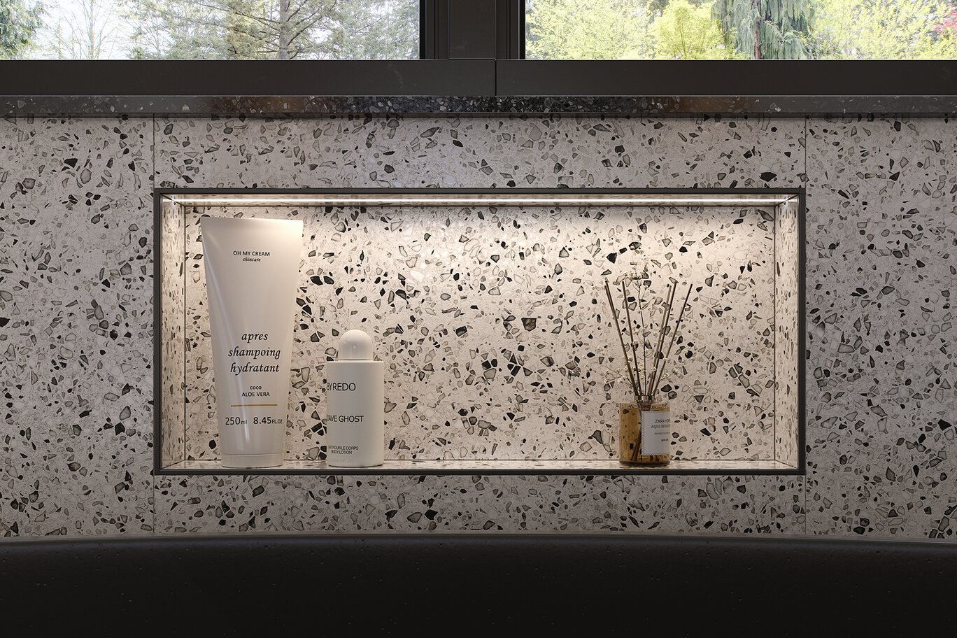 The niche kit includes: Prefabricated shower niche made of KERDI-BOARD with pre-installed waterproof connection box for a code-compliant installation...
