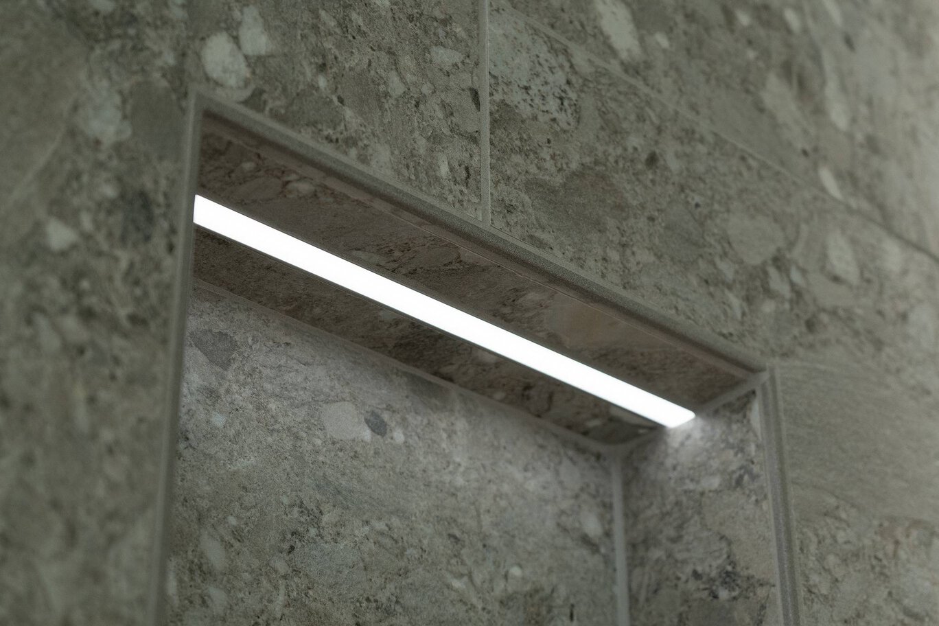 The mounting profile is made of anodized aluminum with satin finish (AE). It is sized to fit along the top of the niche and features a cut out designed to pass the cable. The LED light strip is encased in a silicone tube that provides an evenly diffused line of warm white light measuring 3000K and nests into the mounting profile.