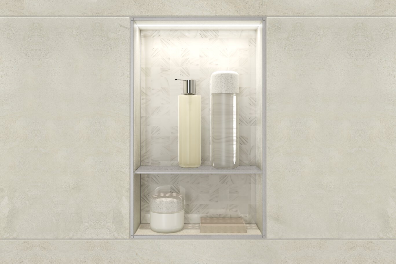 Schluter®-KERDI-BOARD-SNLT is a prefabricated shower niche made of KERDI-BOARD that incorporates a mounting profile with a diffused LED light strip. It features a pre-installed waterproof connection box to ensure the electrical connection is code-compliant. The KERDI-BOARD-SNLT niche can be installed in both KERDI and KERDI-BOARD wall assemblies. The shower niche features a 1/2" (12.5 mm) thick by 2" (50 mm) wide integrated bonding flange and is available in various sizes, with options for vertical or horizontal installation.