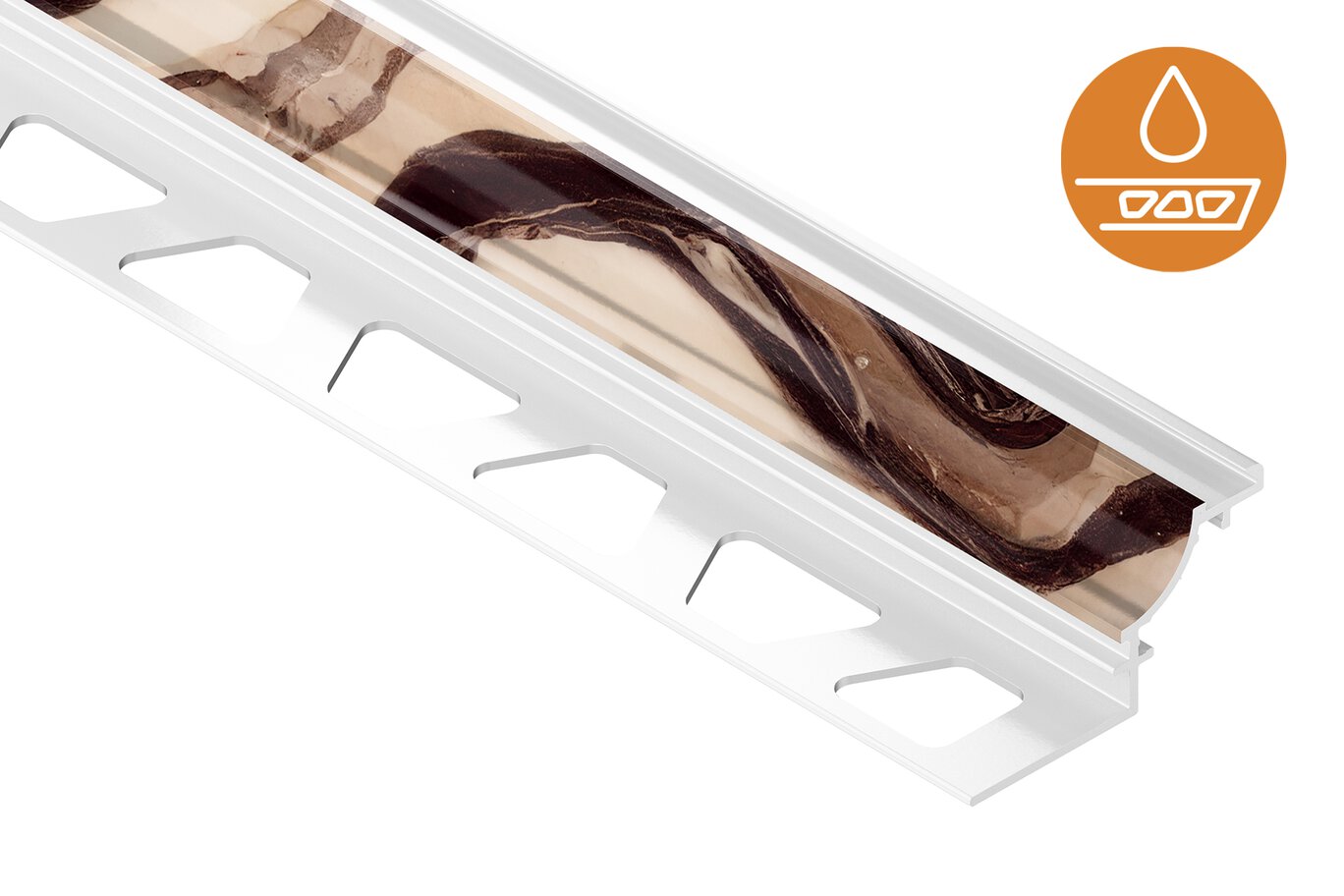 Schluter®-DILEX-AHK features a single trapezoid-perforated anchoring leg, which is secured in the mortar bond coat and a cove section that forms the visible surface. The profile’s 3/8" (10 mm) radius makes DILEX-AHK an attractive option for countertop/backsplash transitions, as it prevents the accumulation of dirt and makes cleaning simple. The profile separates tile fields that meet at inside corners where limited movement is expected. DILEX-AHK prevents surface water penetration and meets the maintenance and hygienic requirements of commercial kitchens, bathrooms, and food-processing plants, or any tiled environment where a sanitary cove base is desired. DILEX-AHK is available in anodized aluminum and color-coated aluminum. Accessories for DILEX-AHK include: inside and outside corners, connectors, and end caps. Outside corners to integrate with Schluter®-QUADEC are available for DILEX-AHK only.