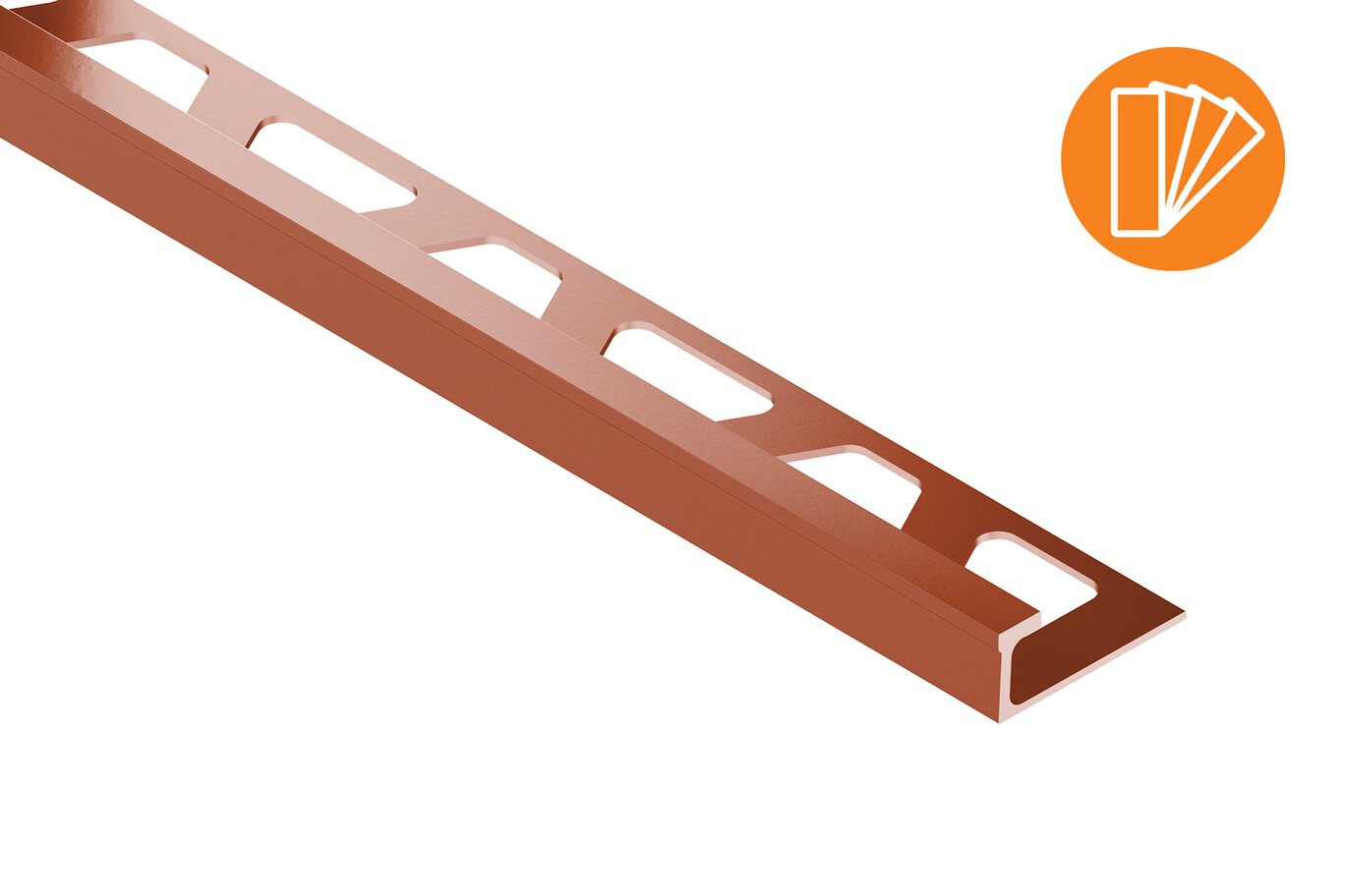 The profile is available in stainless steel, solid brass, chrome-plated solid brass, and anodized aluminum. DECO features a trapezoid-perforated anchoring leg, which is secured in the mortar bond coat beneath the tile, and a 1/4"" (6 mm)-wide visible surface that meets the high aesthetic requirements of showrooms, lobbies, galleries, exhibition booths, etc.