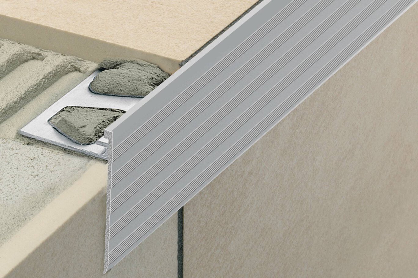 Schluter®-SCHIENE-STEP is a finishing and edging profile for ceramic tile and natural stone installations on countertops, stairs, and tile-over-tile applications on walls. The top of the profile features a vertical wall section that finishes and protects the tile from damage, while the vertical leg covers the edge of the sub-assembly, top of the riser, or existing wall edge.