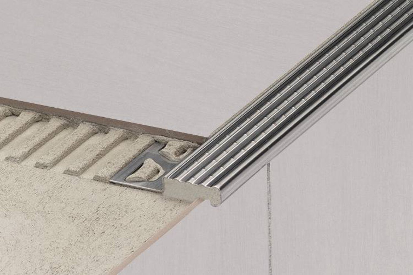 Schluter®-TREP-E is designed to protect tiled stair edges and provide an easily visible, slip-resistant wear surface for durable, safe, and visually appealing stair-nosing design. The profile is made of attractive and durable stainless steel, making it particularly suited for areas subjected to heavy foot traffic, such as offices or public buildings.
