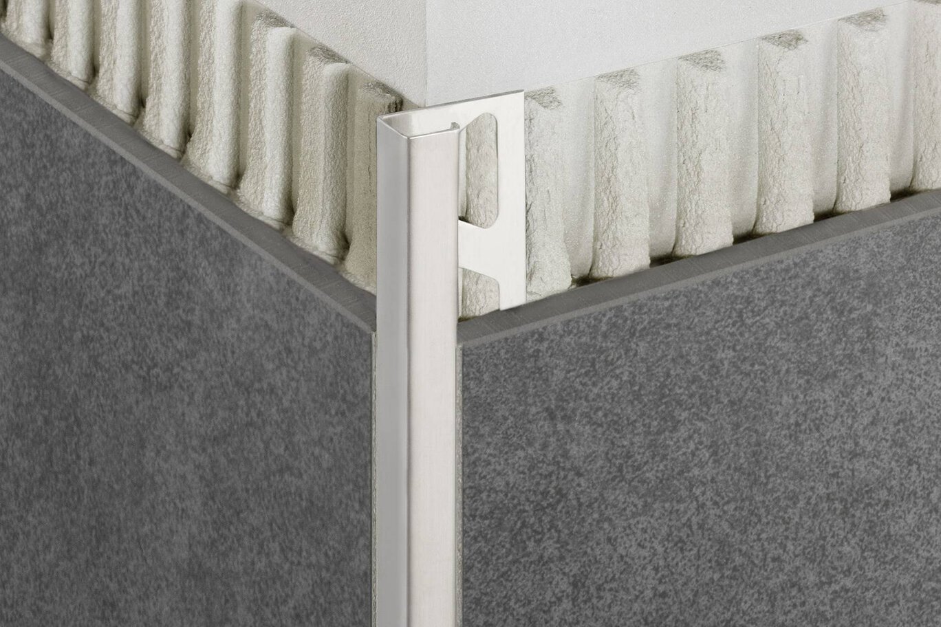 Schluter®-QUADEC is a finishing and edge-protection profile for the outside corners of tiled surfaces. It features a trapezoid-perforated anchoring leg that is secured in the mortar bond coat beneath the tile and a reveal that forms a square outer corner along the surface edge.