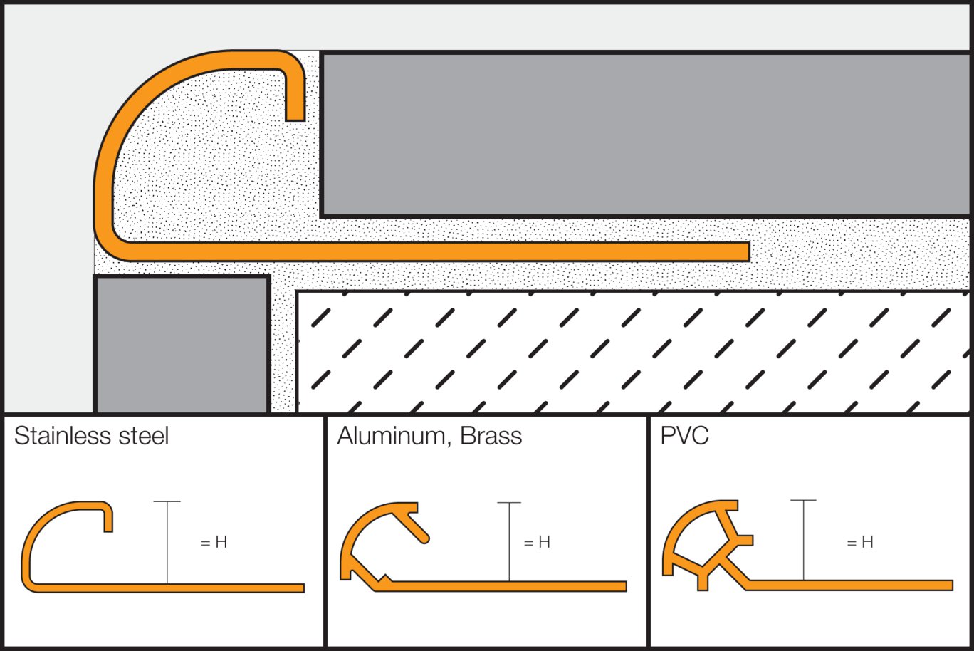The Schluter-RONDEC profile requires no special maintenance or care and is resistant to mold and fungi. Clean profiles periodically using neutral cleaning agents. Stainless steel surfaces exposed to the environment or aggressive substances should be cleaned periodically using a neutral cleaner. Regular cleaning maintains the neat appearance of stainless steel and reduces the risk of corrosion. Avoid the use of strong acids (e.g. hydrochloric or hydrofluoric) and base/alkaline cleaners (e.g. bleach, ammonia, chlorides). Do not use abrasive cleaning agents and tools. Stainless steel surfaces develop a sheen when treated with a chrome-polishing agent. Oxidation films on exposed solid brass or aluminum may be removed with a common polishing agent but will form again. In the case of chrome plated brass, anodized aluminum, and color coated aluminum and textured color-coated aluminum, do not use abrasive cleaning agents.
