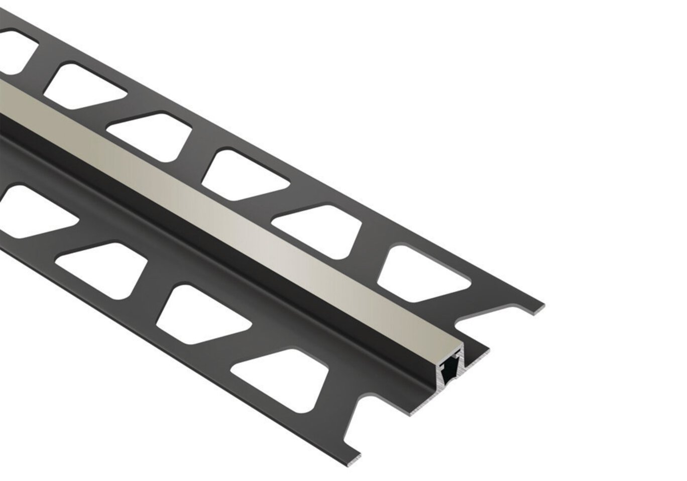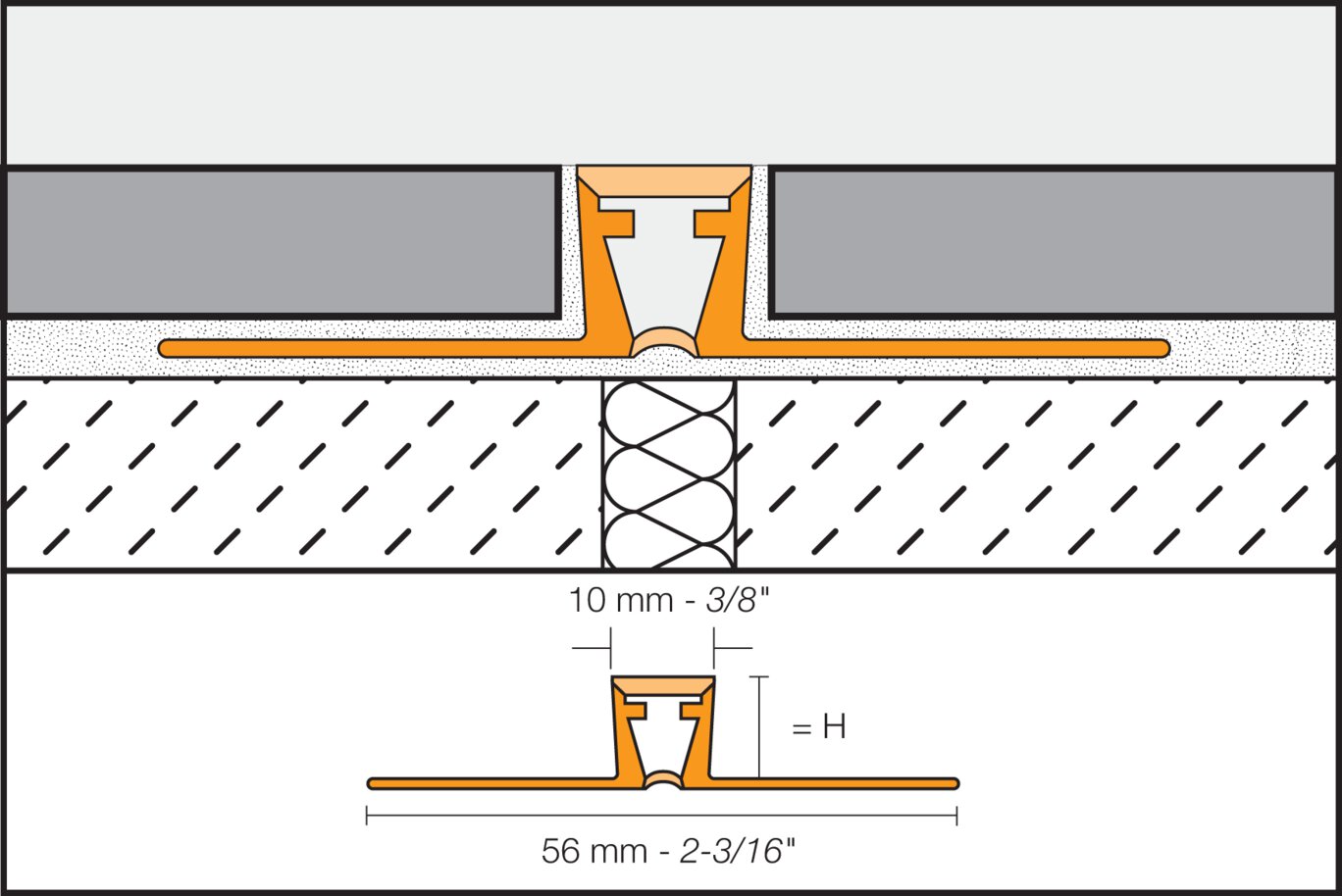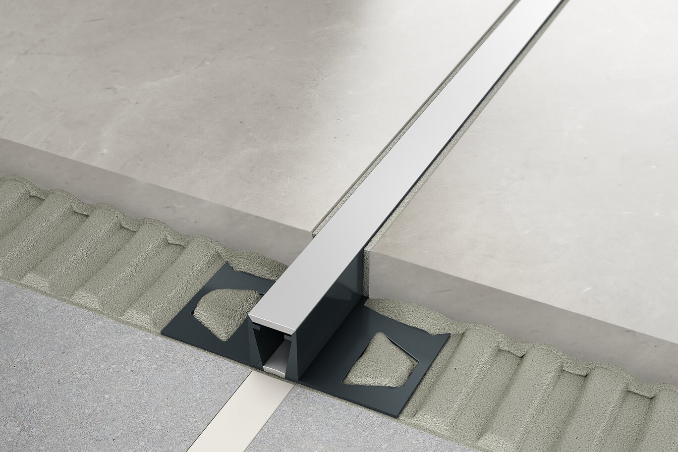 Schluter®-DILEX-BWB features trapezoid-perforated anchoring legs, made of recycled rigid PVC, which are secured in the mortar bond coat and provide edge protection for adjacent tiles. The profile separates individual fields in the tile covering and accommodates movement via the soft chlorinated polyethylene (CPE) movement zone, which also forms the visible surface. The movement zone is 3/8" (10 mm) wide, matching common movement joint widths, and is thus capable of accommodating relatively large movements. DILEX-BWB is suitable for both residential use and medium-duty commercial applications subject to light mechanical loads (e.g., offices or stores).