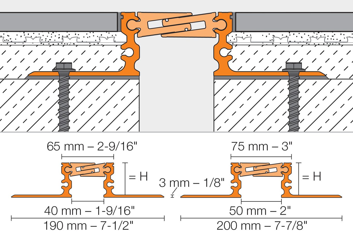 Schluter®-DILEX-STF is a maintenance-free expansion joint profile system made of aluminum. The profile assembly comes pre-drilled, secured, and aligned with brackets at the installation width. The profile anchoring legs secure to the substrate with concrete anchoring screws. Mortar and floor coverings are applied over the anchoring leg. The interlocking center section allows movements of ± 1/4" (6 mm) [with a joint width of 1-9/16” (40 mm)] or ± 3/8" (10 mm) [with a joint width of 2" (50 mm)]. The telescoping center components allow for the absorption of movement in three dimensions.