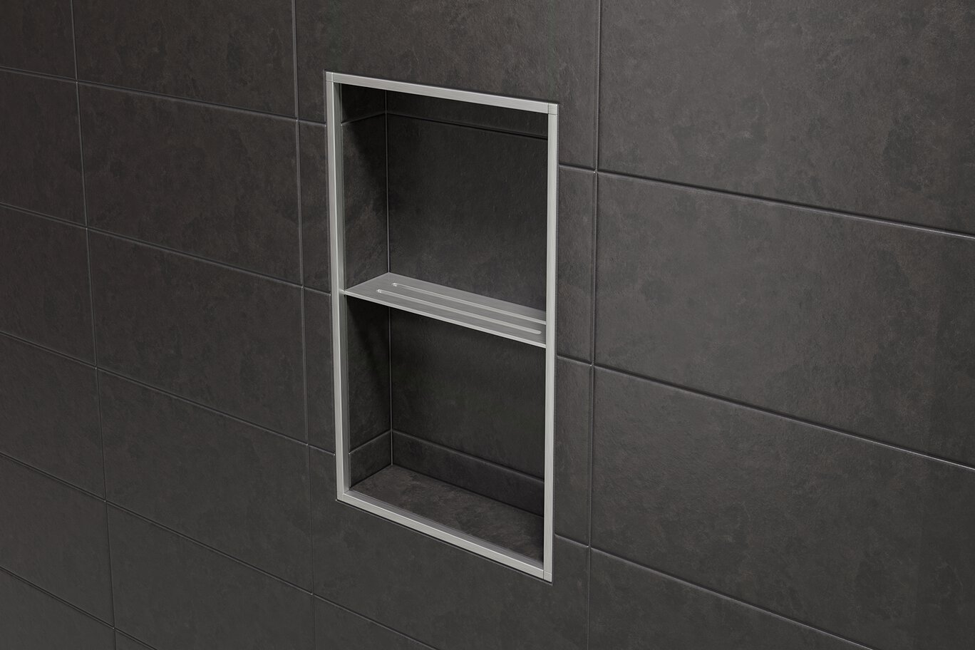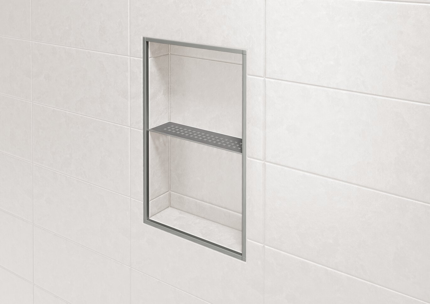 Schluter®-SHELF-N is a wall storage system available in brushed stainless steel or aluminum in a range of textured color-coated finishes including stone grey, pewter, cream, ivory, greige, bronze, dark anthracite, matte black, and matte white. The shelves are 5/32″ (4 mm) -thick and feature designs coordinating with the KERDI-DRAIN and KERDI-LINE drain grates. They can be used in showers and other tiled wall applications (e.g., kitchens and baths). SHELF-N is a rectangular shelf that fits the prefabricated Schluter®-KERDI-BOARD-SN/-SNLT shower niches. It is installed in conjunction with the tile.