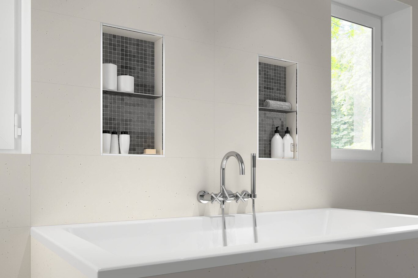 2. Place the SHELF-N on the tiles with the rounded edges facing the inside of the niche.