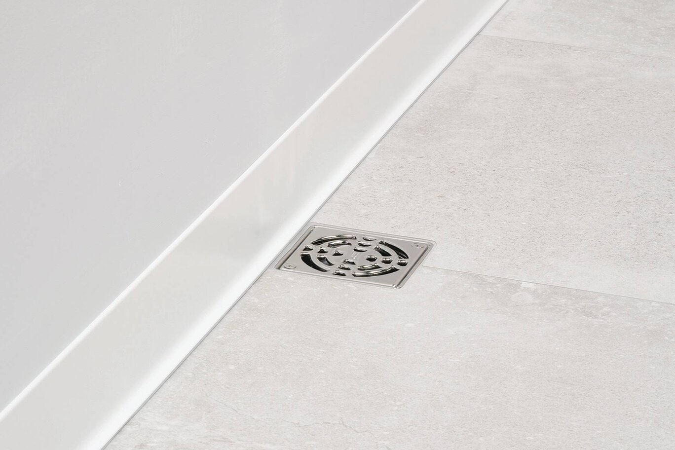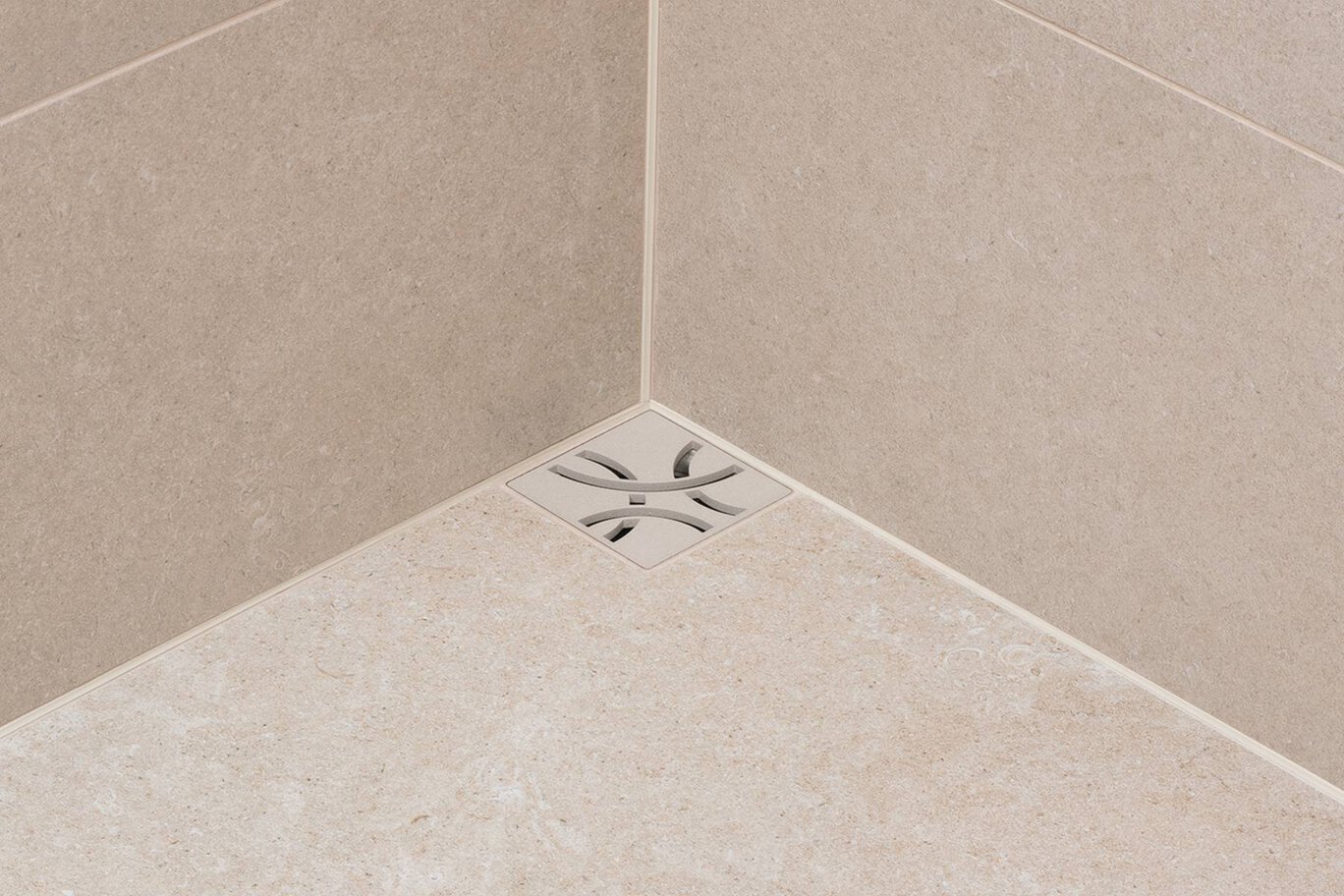 The KERDI-DRAIN-F grate assembly consists of a frame, which can be seamlessly adjusted to the thickness of the ceramic tile or stone covering via the vertical height adjustment collar and grates that are placed within the frame. The 4" (100 mm) standard grate assembly frame features an approximately 1/8" (3 mm) wide reveal after installation, and grate/frame combinations are available in stainless steel in CLASSIC design or anodized aluminum in CONTOUR design, both available in a variety of finishes. The 4" (100 mm) KERDI-DRAIN-STYLE grate assembly frame features a minimal reveal after installation. It is made of brushed stainless steel and can be combined with one of three grate design options: FLORAL, CURVE, or PURE. Various metallic and color-coated finishes are available. Please note that the 4" (100 mm) TILE grate and the 6" (150 mm) square and round grates are not compatible with KERDI-DRAIN-F.