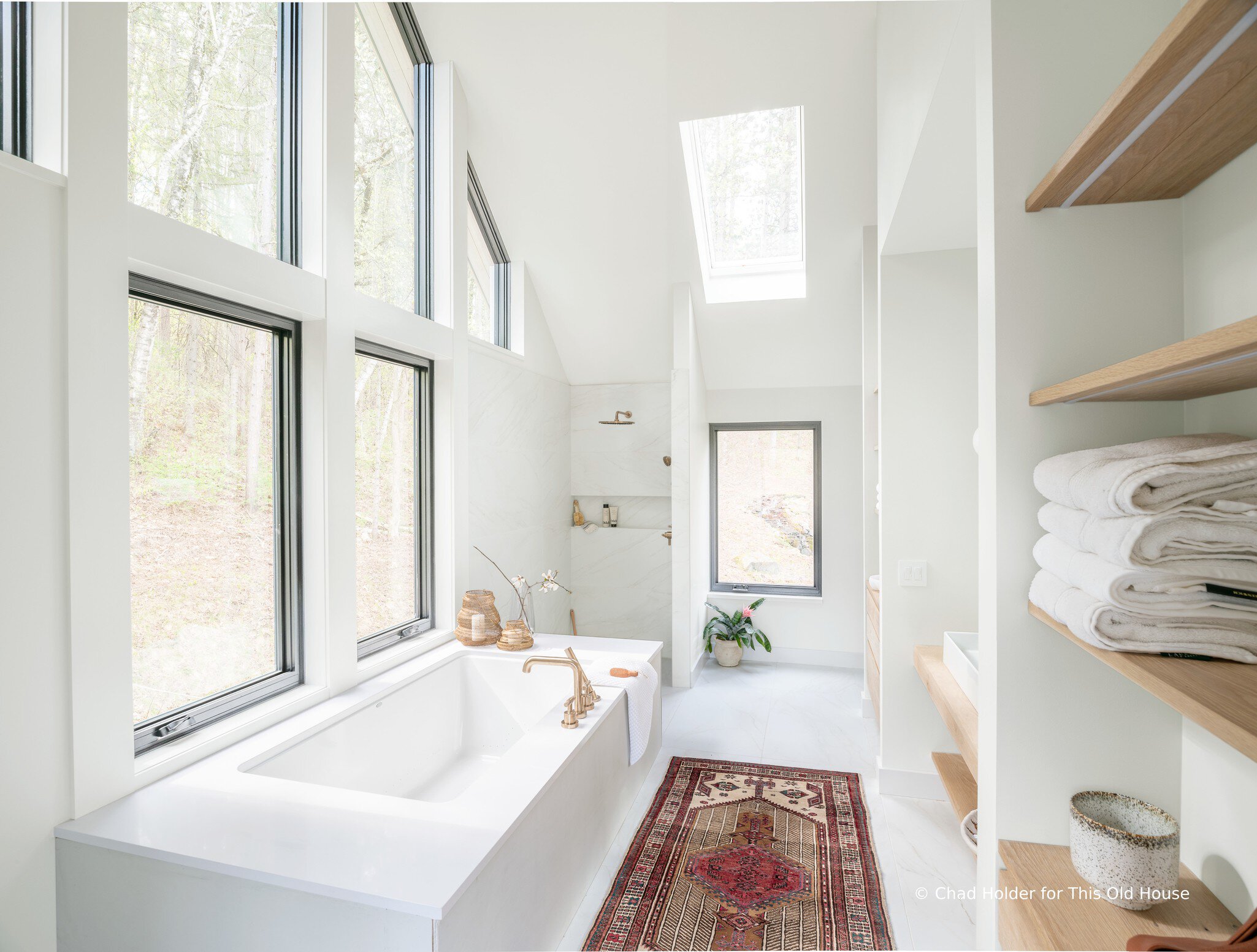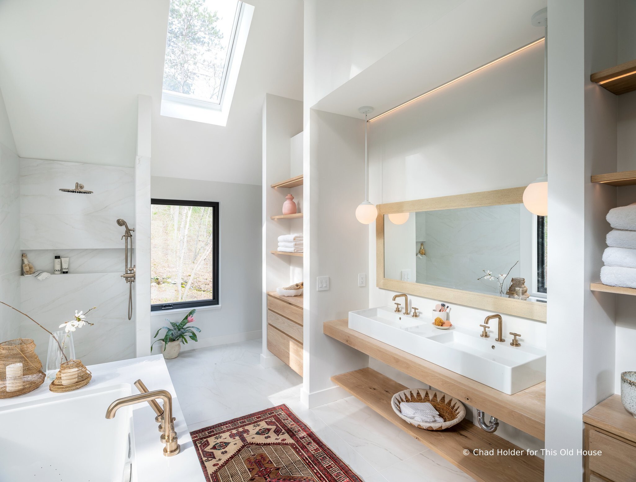 A big, bright bathroom features a curbless shower with a KERDI-LINE drain and custom KERDI-BOARD niche that all blend right in.
