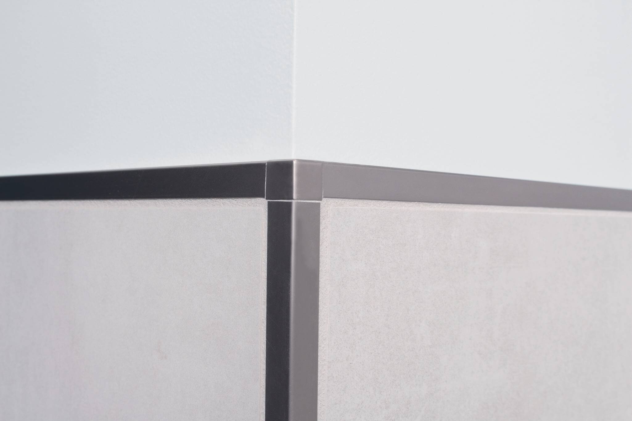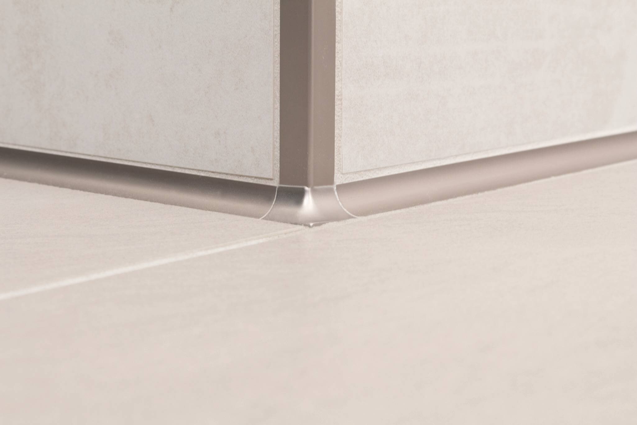 The QUADEC wall profile for outside corners and DILEX-AHK cove-shaped profile are both in brushed nickel anodized aluminum.