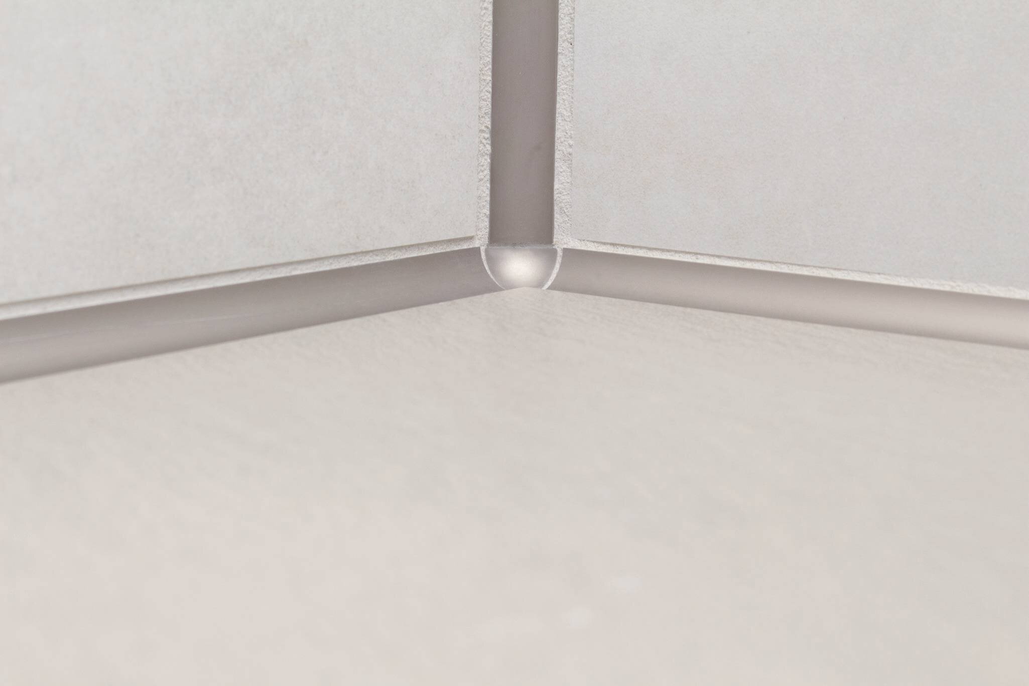 Used in inside corners, DILEX-AHK in brushed nickel anodized aluminum eliminates the need for unsightly caulking.