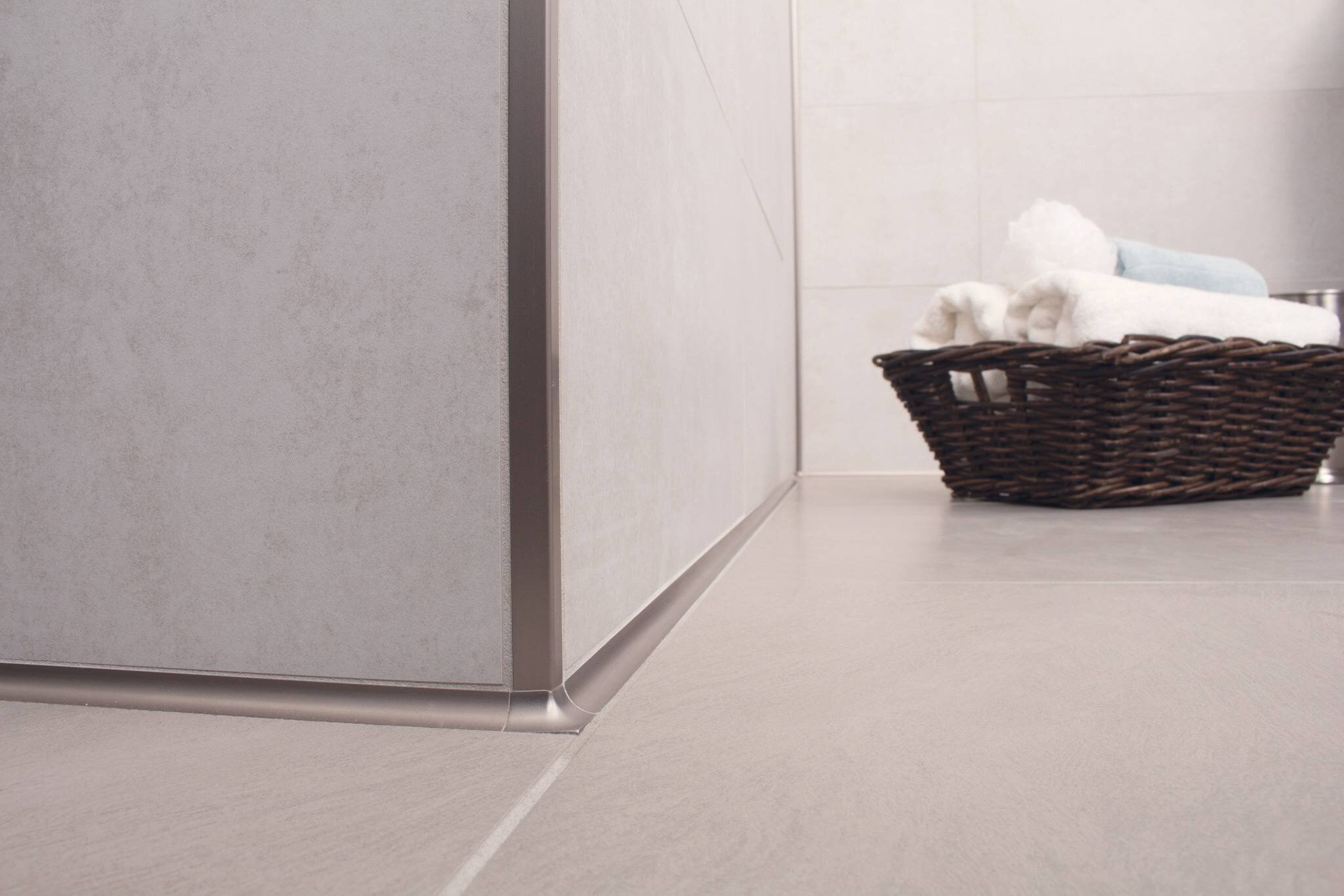 QUADEC in brushed nickel anodized aluminum seams the outside wall corners while DILEX-AHK, also in brushed nickel, provides a nice cove-shape transition between the floor and wall.