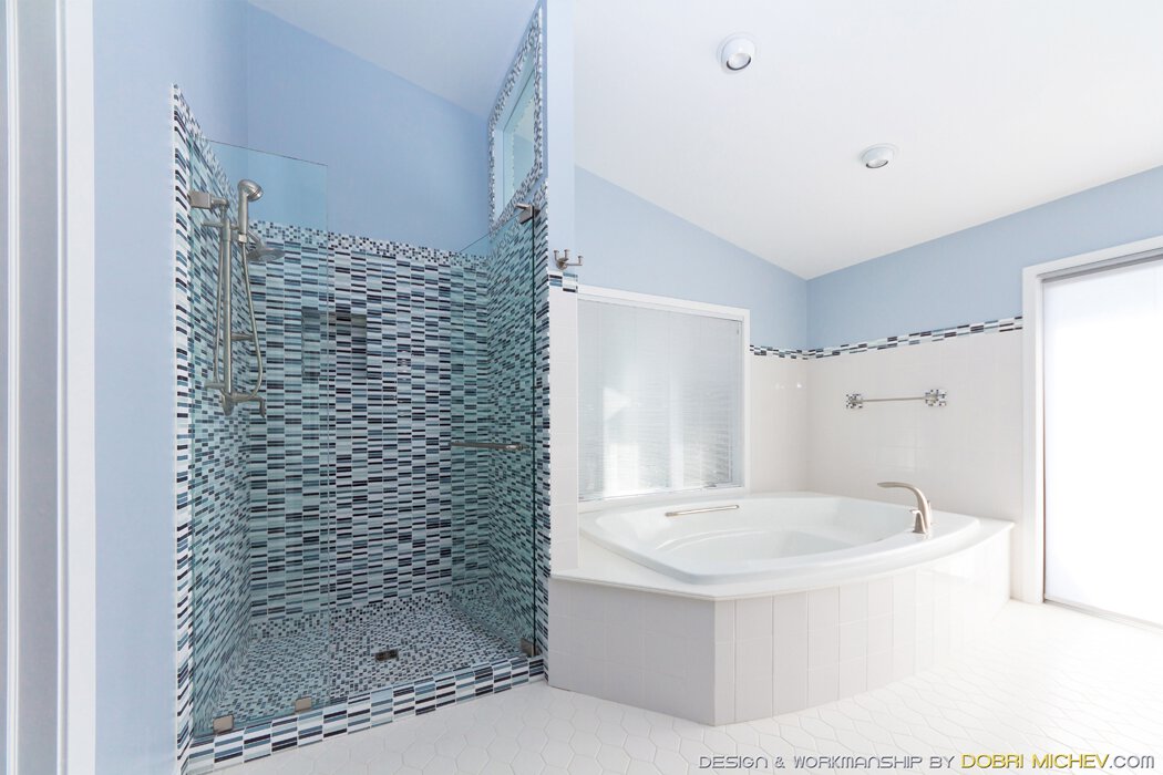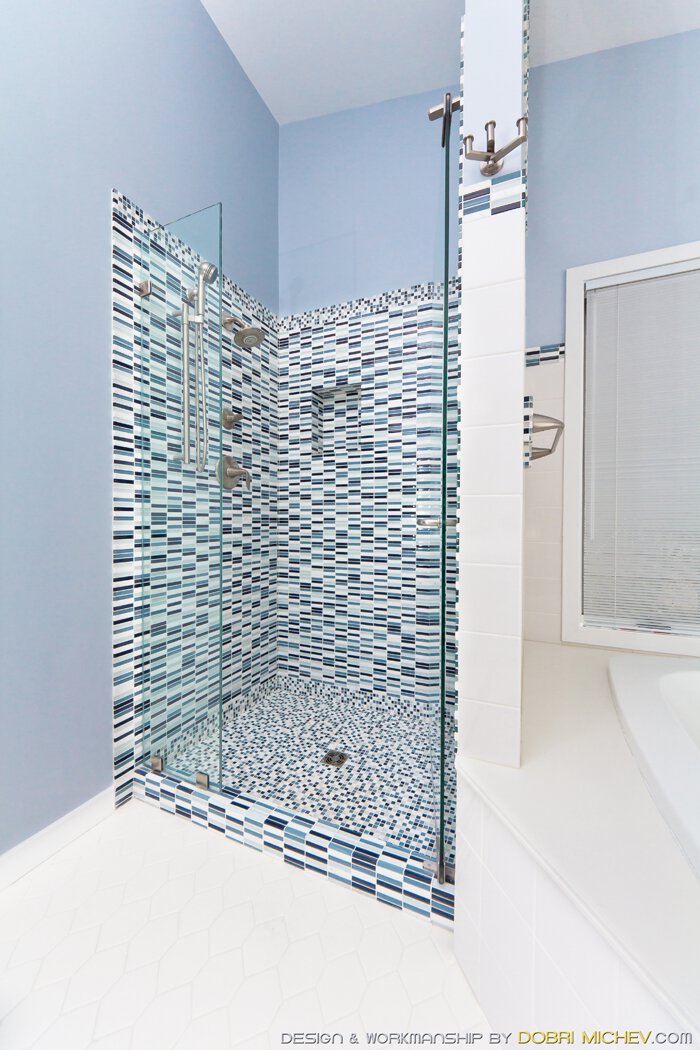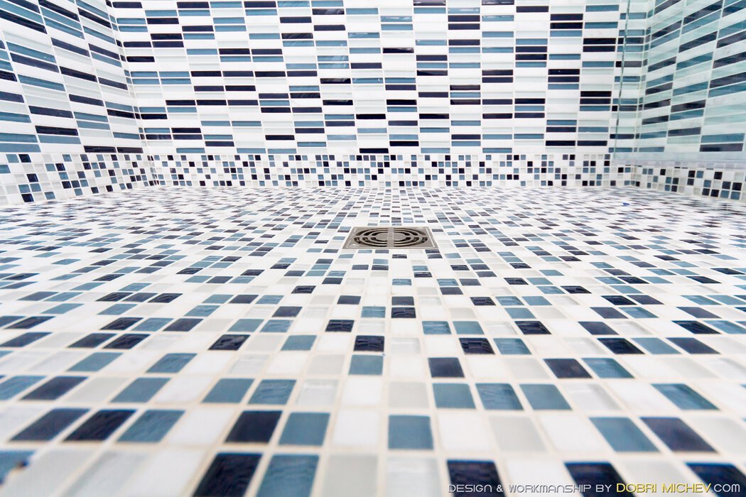 The KERDI-DRAIN CONTOUR in this shower features the 4" stainless steel grate option to match the rest of the bathroom accents.
