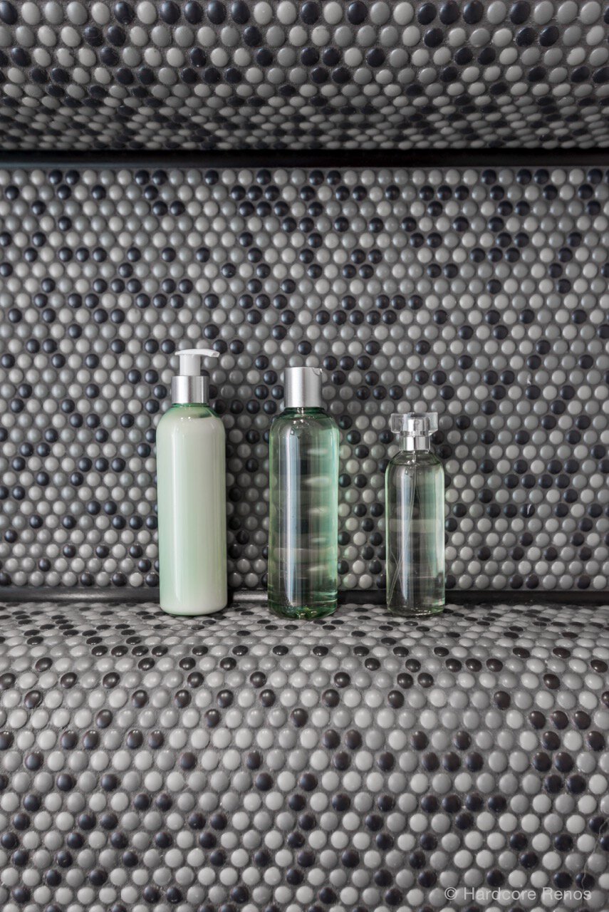 This luxuriously curved shower wall was created using KERDI-BOARD-V, a universal, waterproof tile substrate that features vertical grooves for creating curved elements. The DILEX-AHK in a pewter finish, frames the recessed portion of the curve exquisitely.