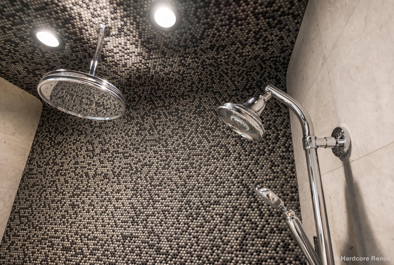 The shower walls were constructed using KERDI-BOARD--a universal, waterproof substrate for tile. All seams were sealed using KERDI-BAND. KERDI-SEAL protects all pipe extrusions from water penetration.