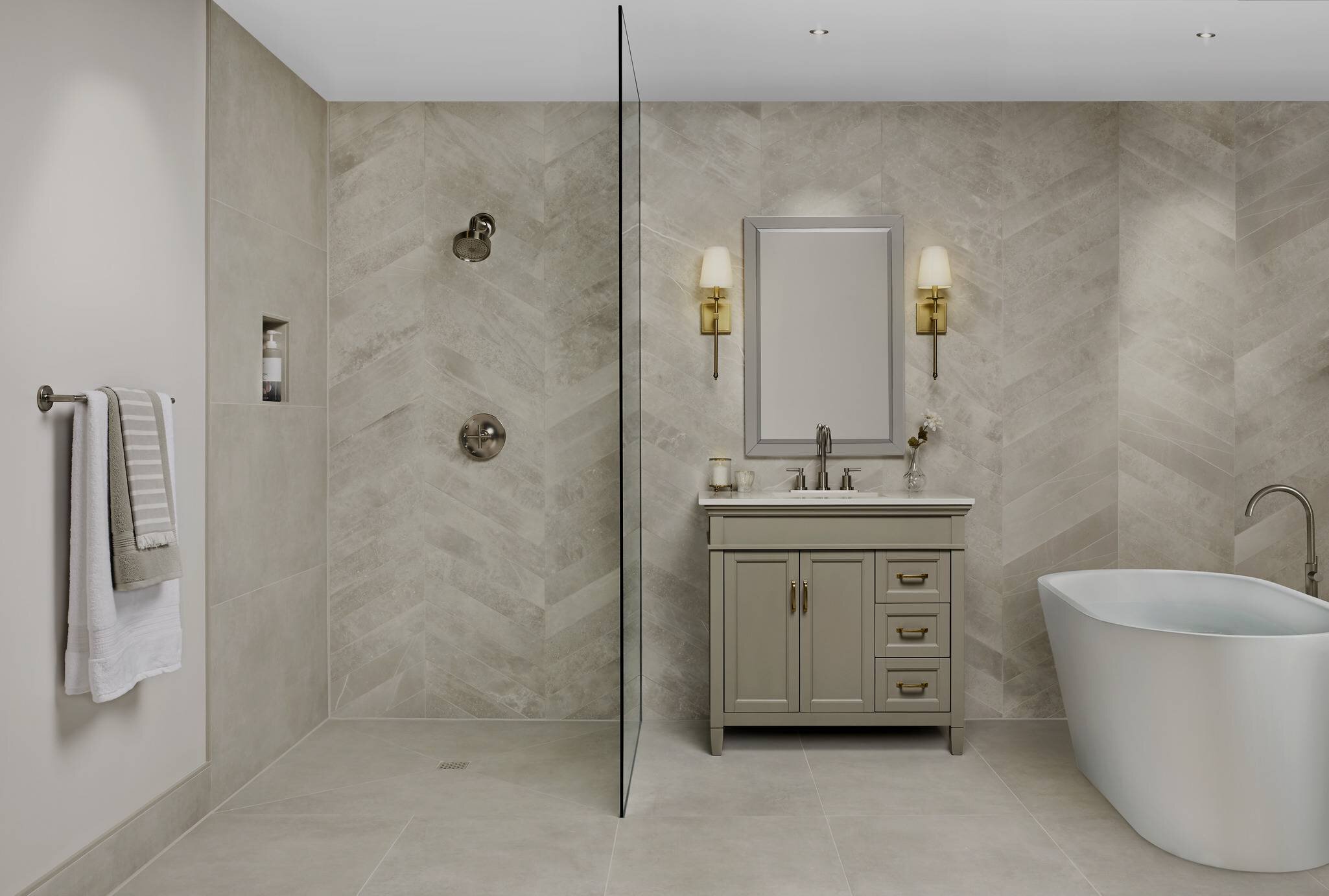 Down to earth elegant in a neutral bathroom, that has it all. The Schluter-Shower System was used to create this waterproof retreat. Muted tones meet impact when various textures come into play.
