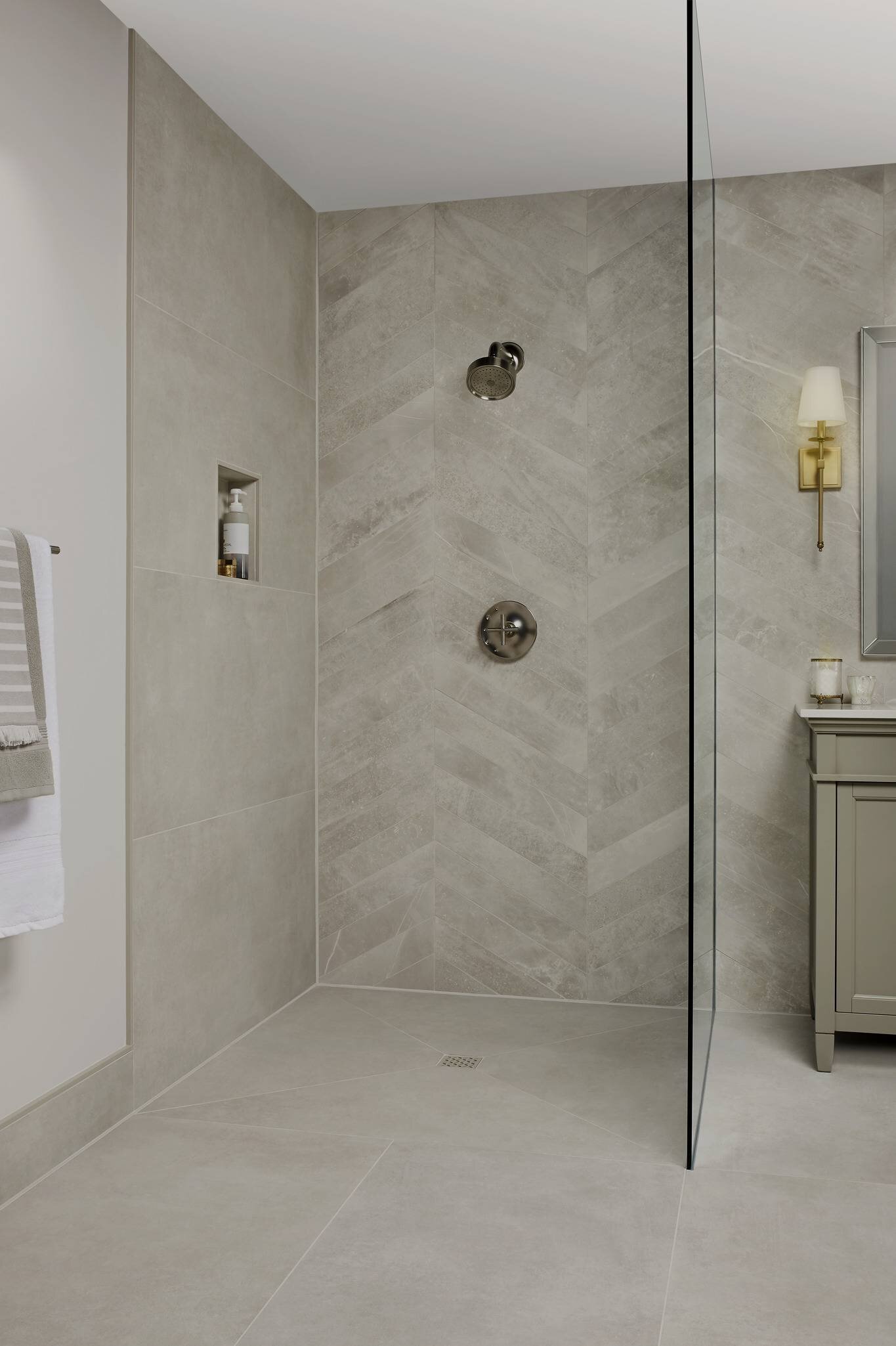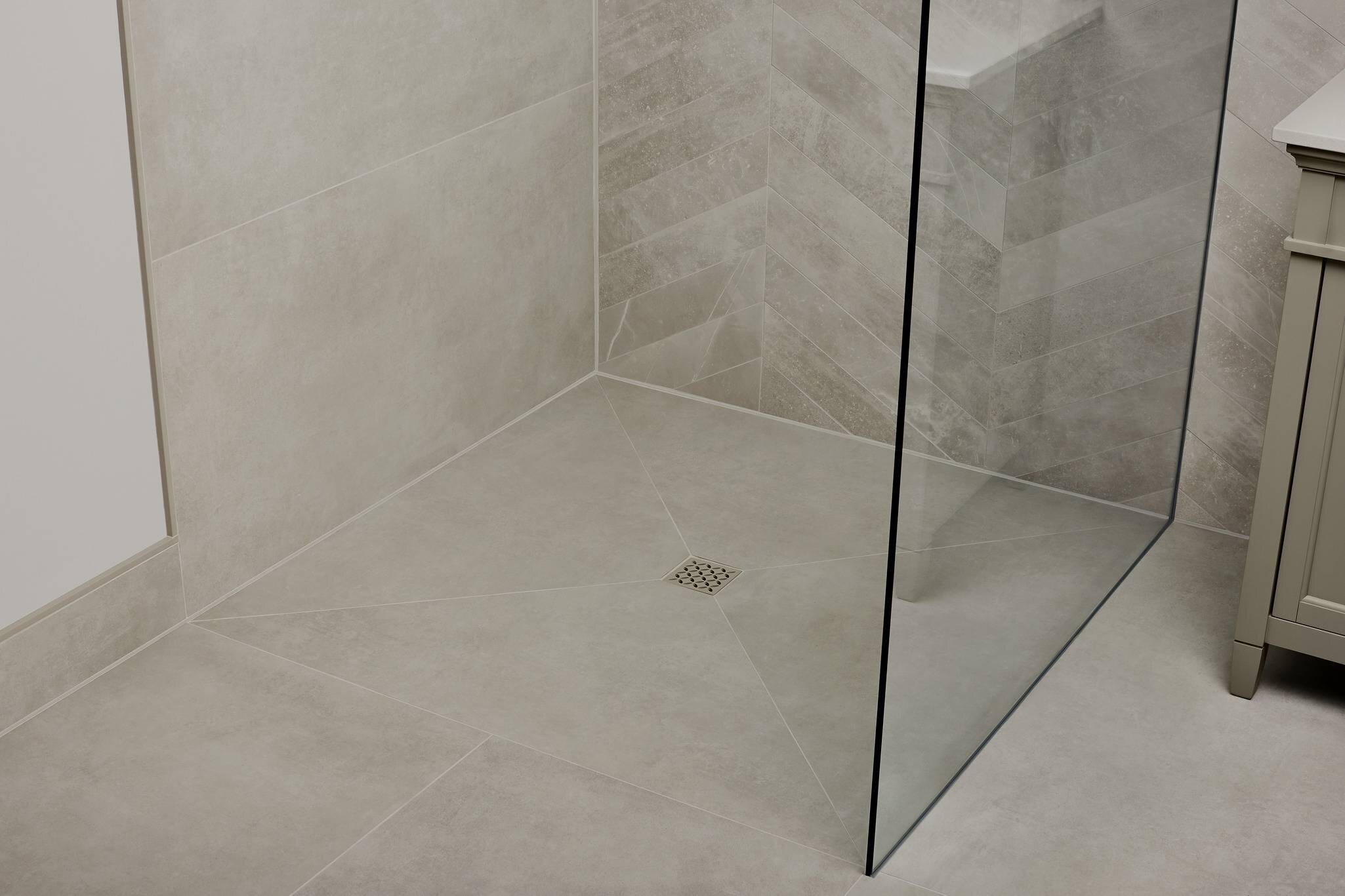 The KERDI-DRAIN-STYLE grate and QUADEC profile in a matching textured cream finish play off the earthy tile choice.