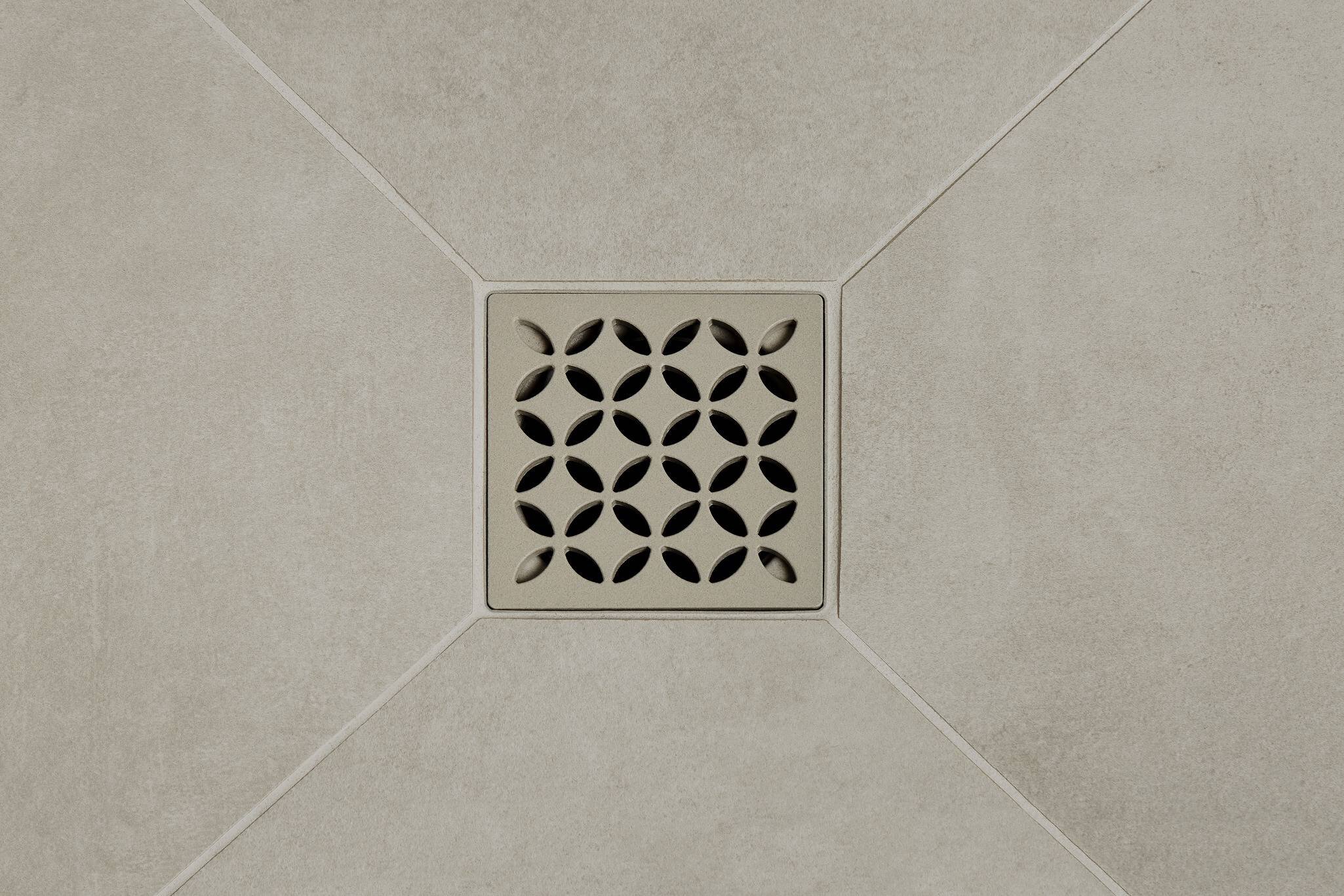 KERDI-DRAIN-STYLE grate in a TRENDLINE textured cream finish completes the earthy look with a touch of Floral elegance.