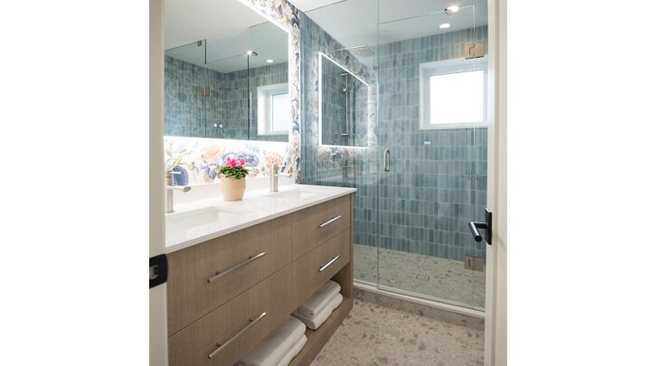 As seen on Love It or List It, this stunning bathroom combines smart functionality with soft, modern design. Featuring KERDI waterproofing system, a sleek vanity, and soothing blue tiles to create a bathroom that feels fresh, functional, and beautifully put together.
