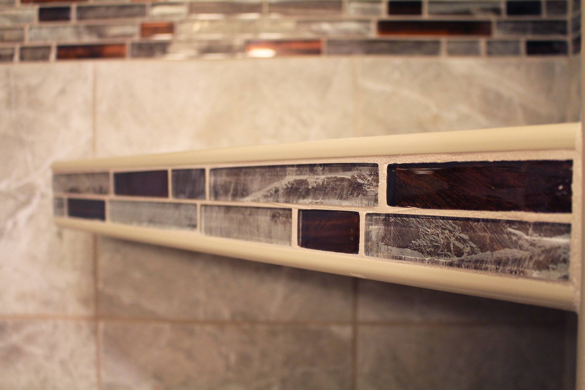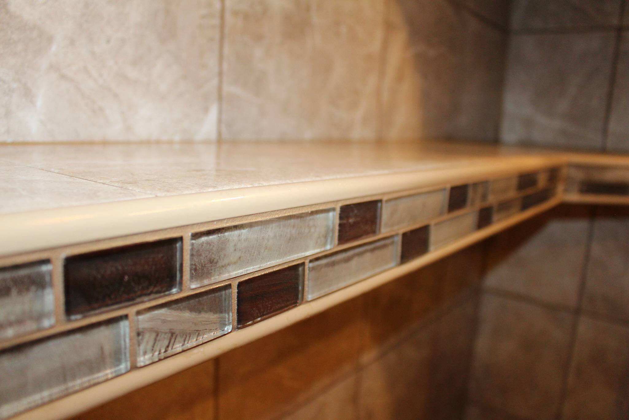 A convenient mosaic shelf was created using 2" KERDI-BOARD and framed with the RONDEC profile in sand pebble.