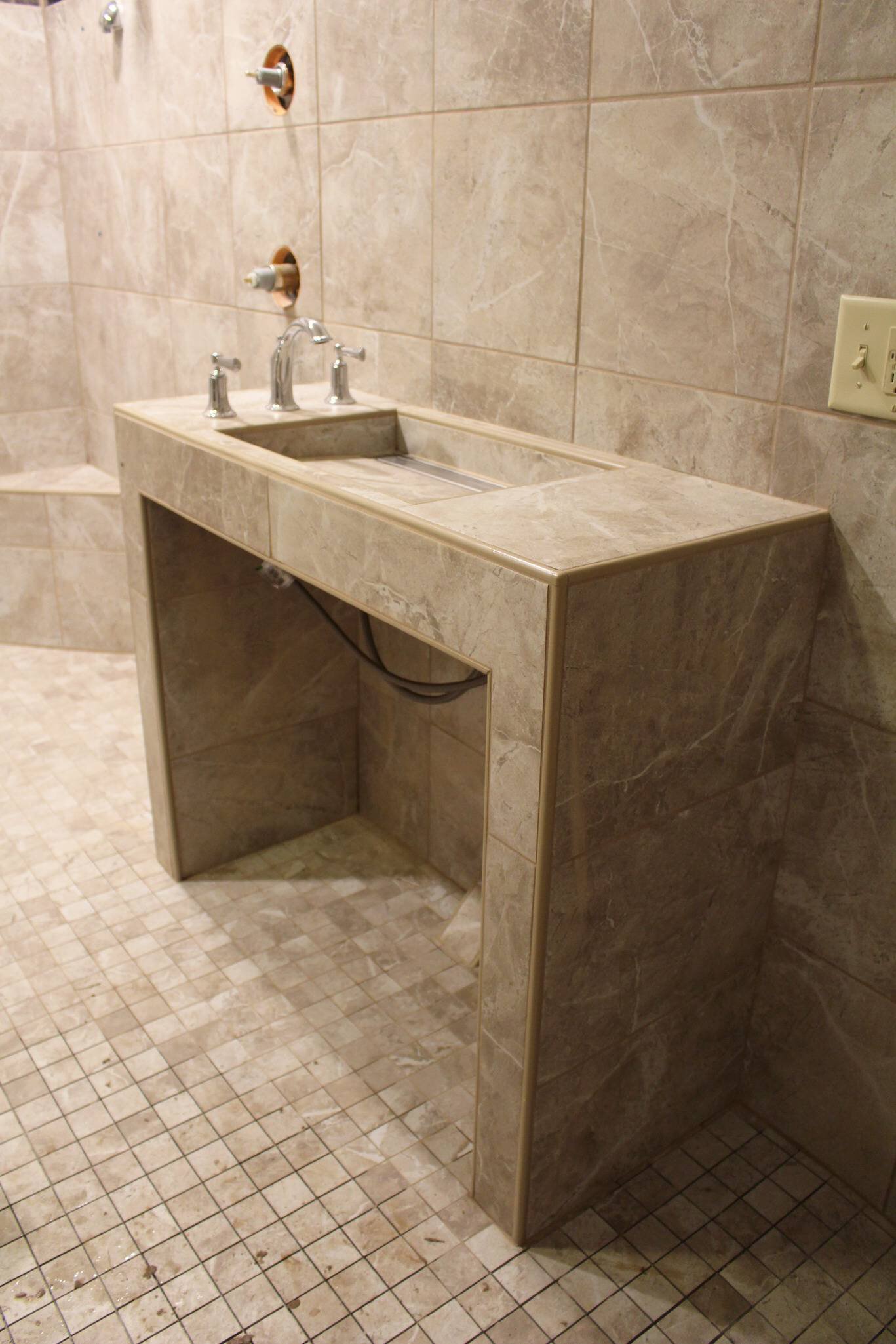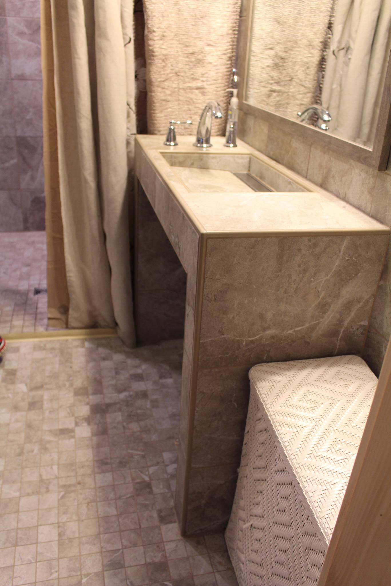 This custom vanity has been created using KERDI-BOARD to easily accommodate wheelchair access. The tiled structure is framed with RONDEC profiles in sand pebble finish. The recessed sink features the KERDI-LINE linear drain with the SOLID grate in stainless steel. DITRA-HEAT warms the bathroom tile while preventing it from cracking.