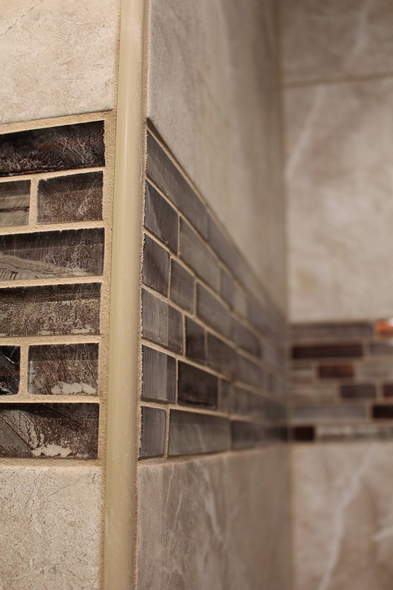 The outside corner of this tile wall with mosaic feature strip is trimmed with RONDEC in sand pebble.