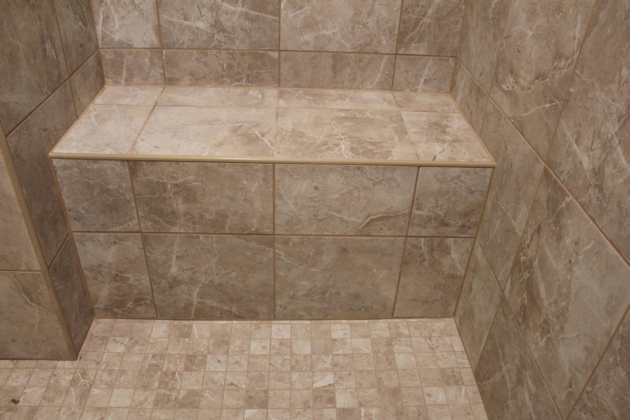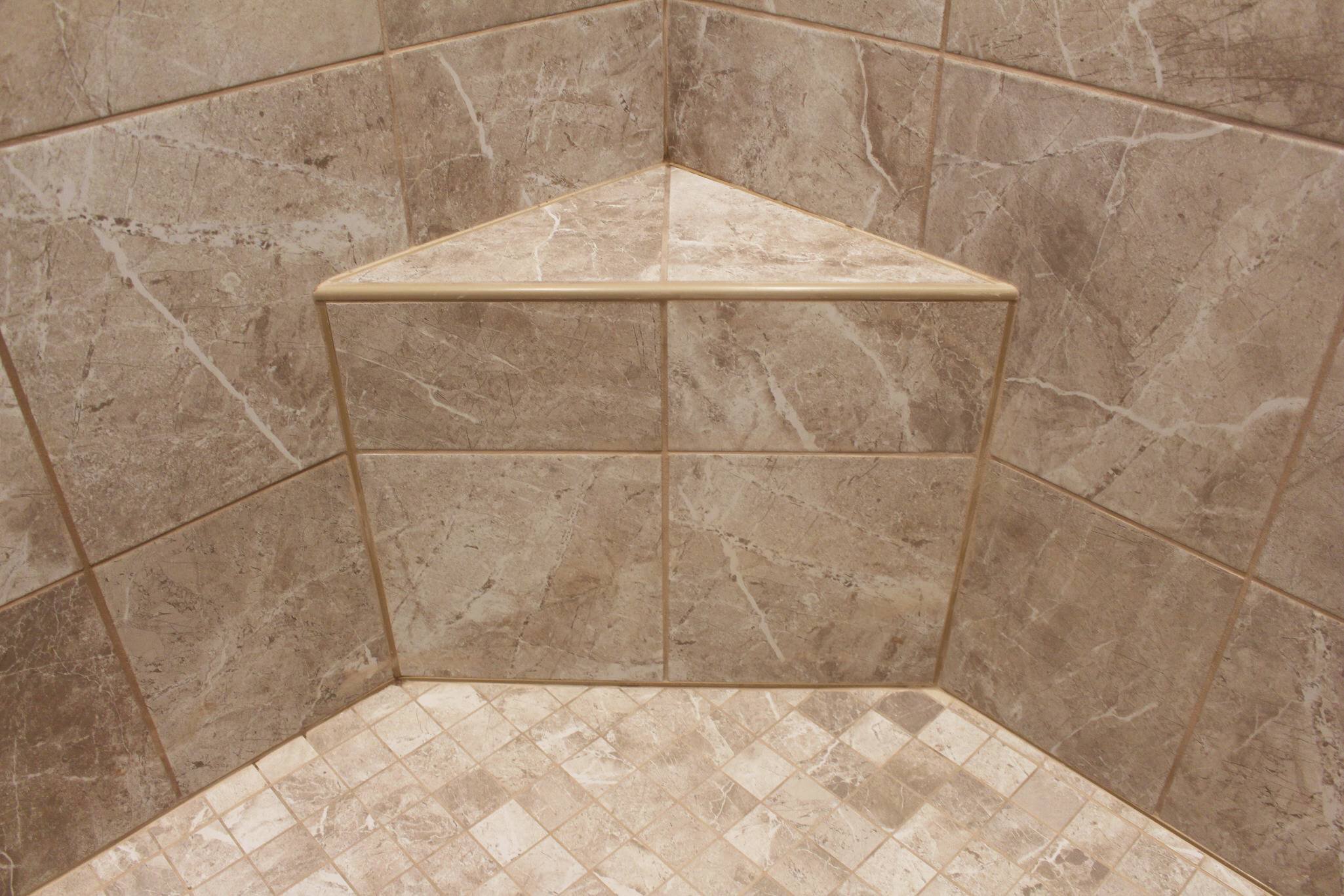 The KERDI-BOARD-SB rectangular shower bench, which is framed using the RONDEC proflile, tucks away nicely in the nook of the shower.