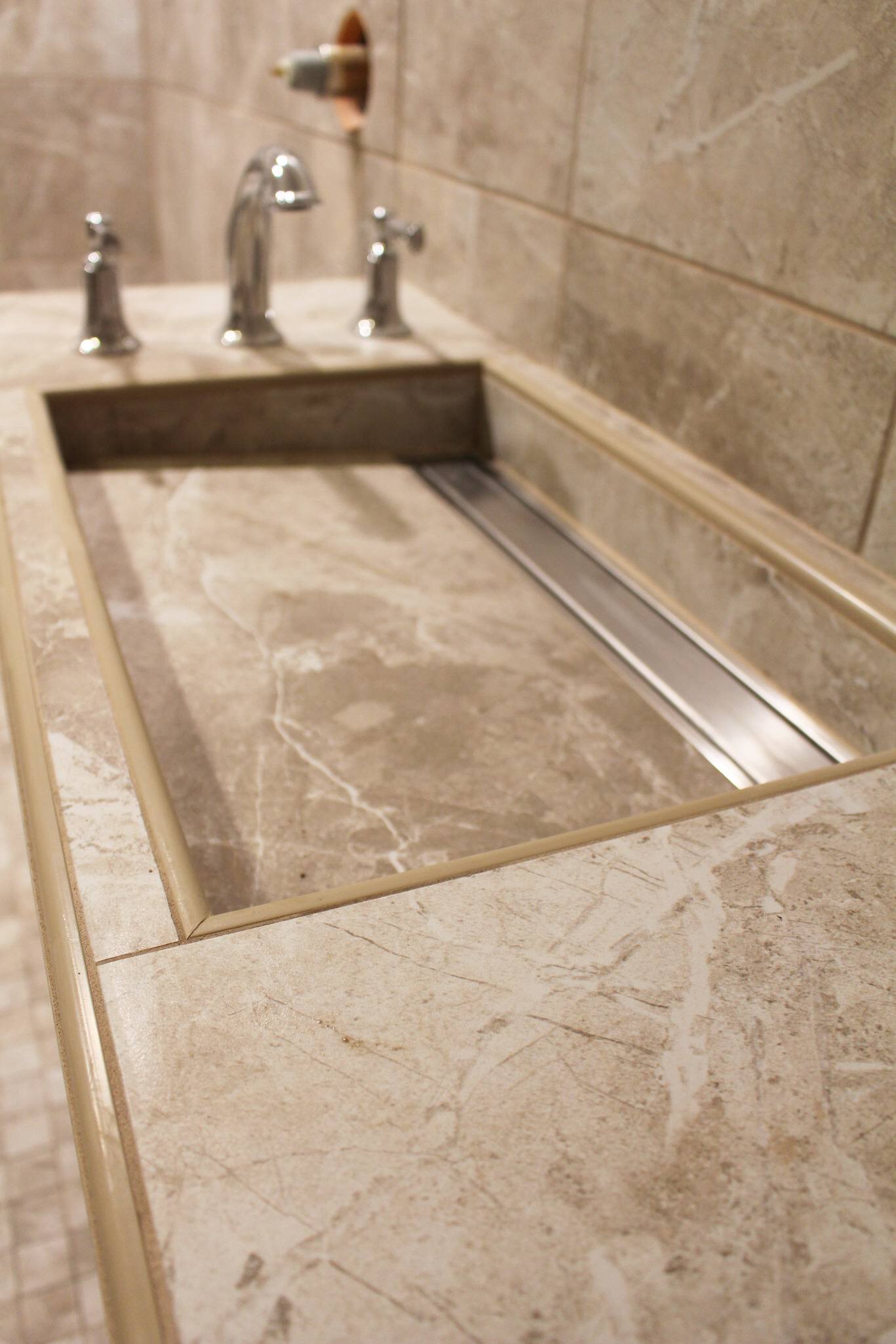 The custom tile vanity and sink were created using KERDI-BOARD universal building panels. The sink features a KERDI-LINE drain with a SOLID grate in stainless steel. The vanity is framed with the RONDEC profile in sand pebble. Seams sealed by KERDI-BAND.