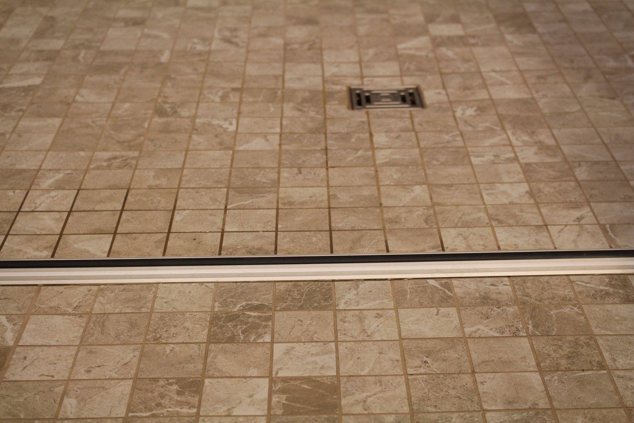 This custom shower features the KERDI-SHOWER-R shower ramp which creates a smooth transition between the shower floor and general floor area. The SHOWER-PROFILE-WSK-EK acts as a splashguard at the entrance of this curbless shower, keeping splashes contained and allowing for wheelchair accessibility.