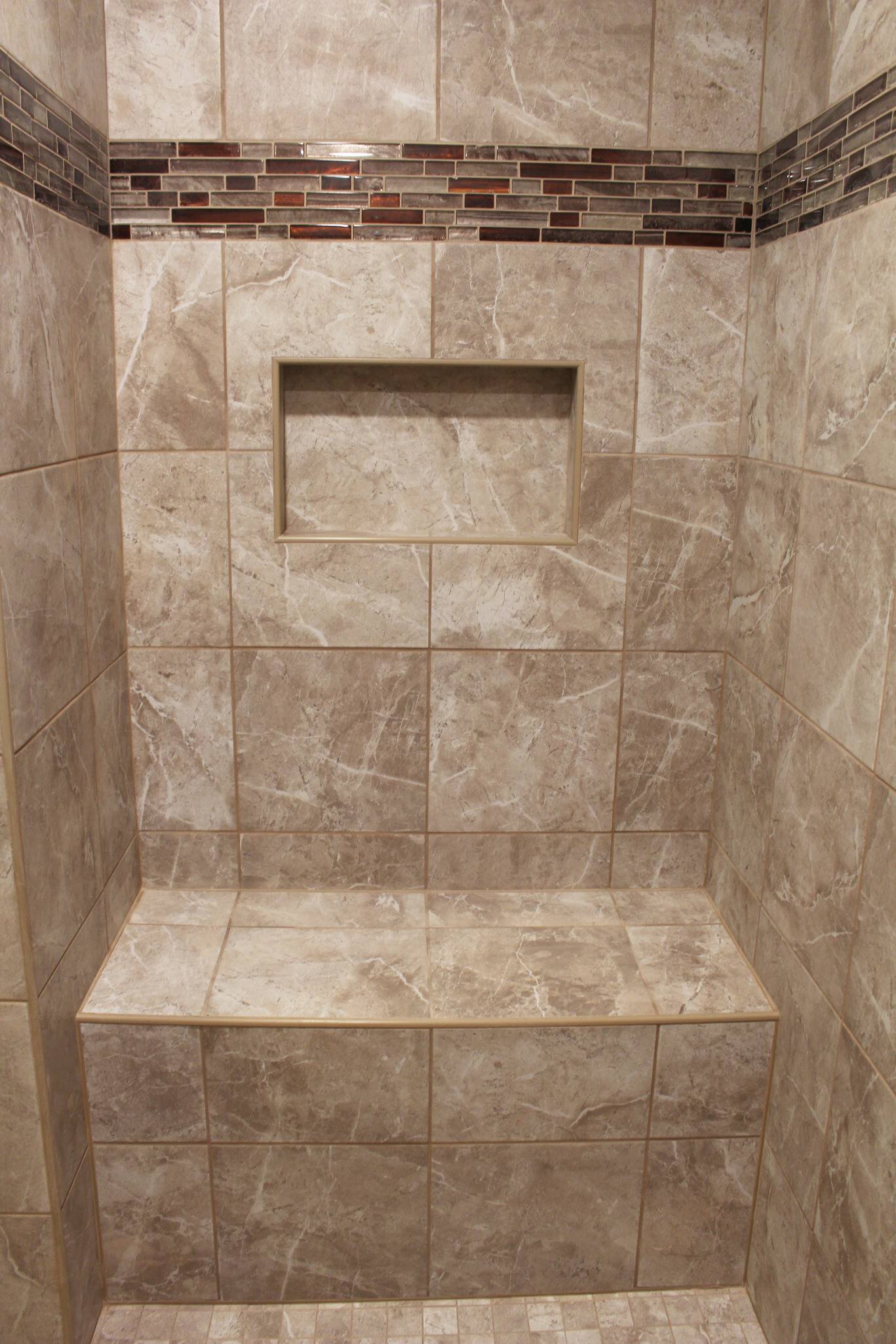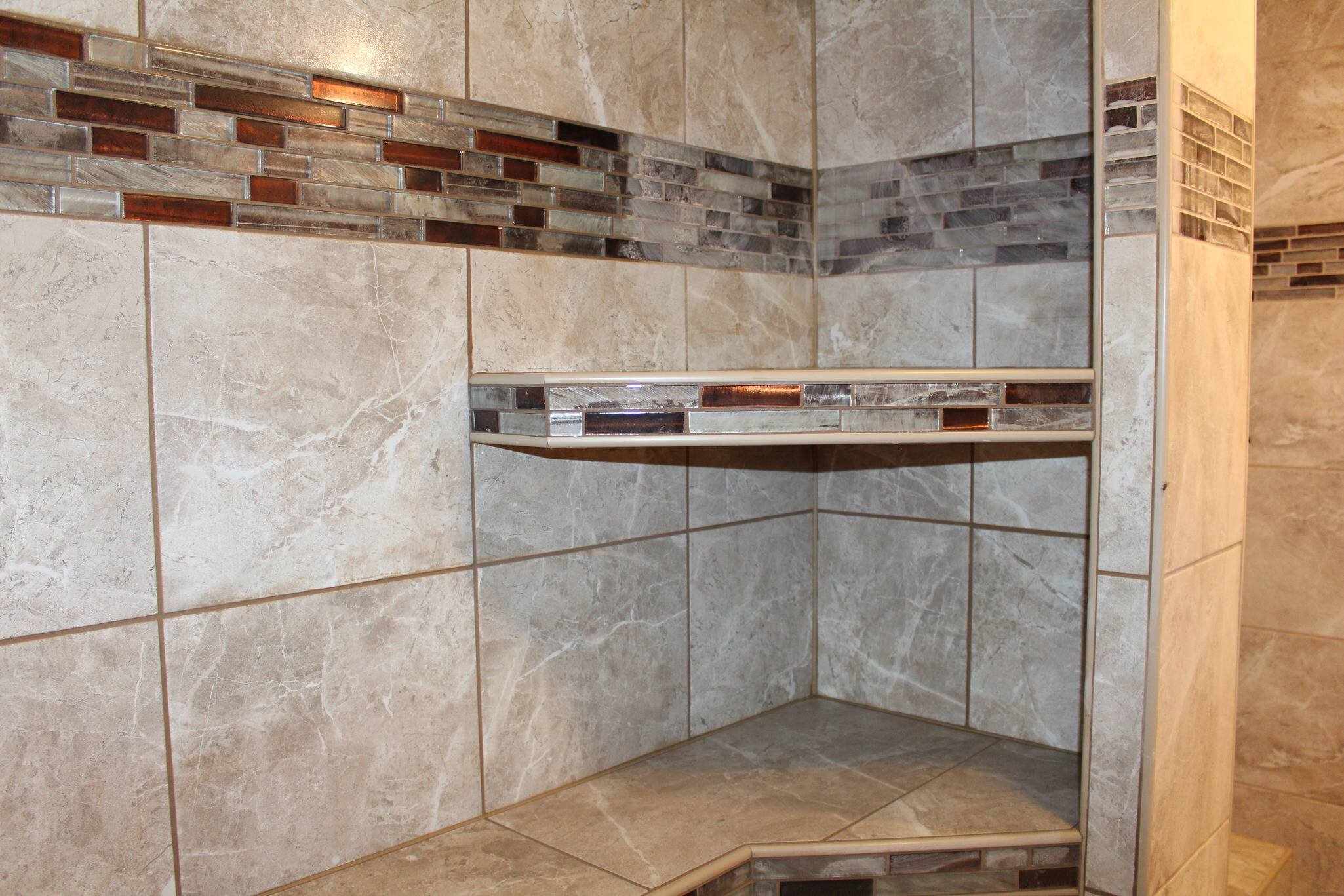 The KERDI-BOARD-SB rectangular shower bench tucks away nicely in the nook of the shower. The KERDI-BOARD-SN shower niche, as well as the bench, are framed with the RONDEC profile. KERDI provides effective waterproofing from beneath the tile.