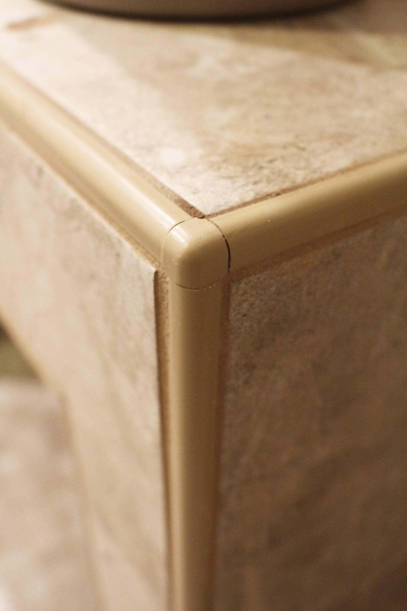 The custom KERDI-BOARD vanity is framed with the RONDEC profile and corner pieces in sand pebble. Seams sealed by KERDI-BAND.