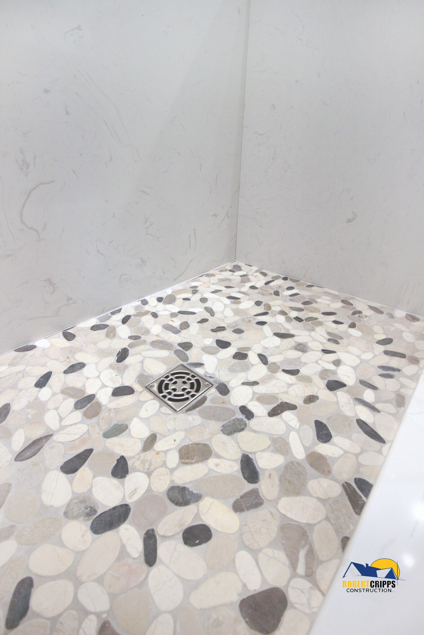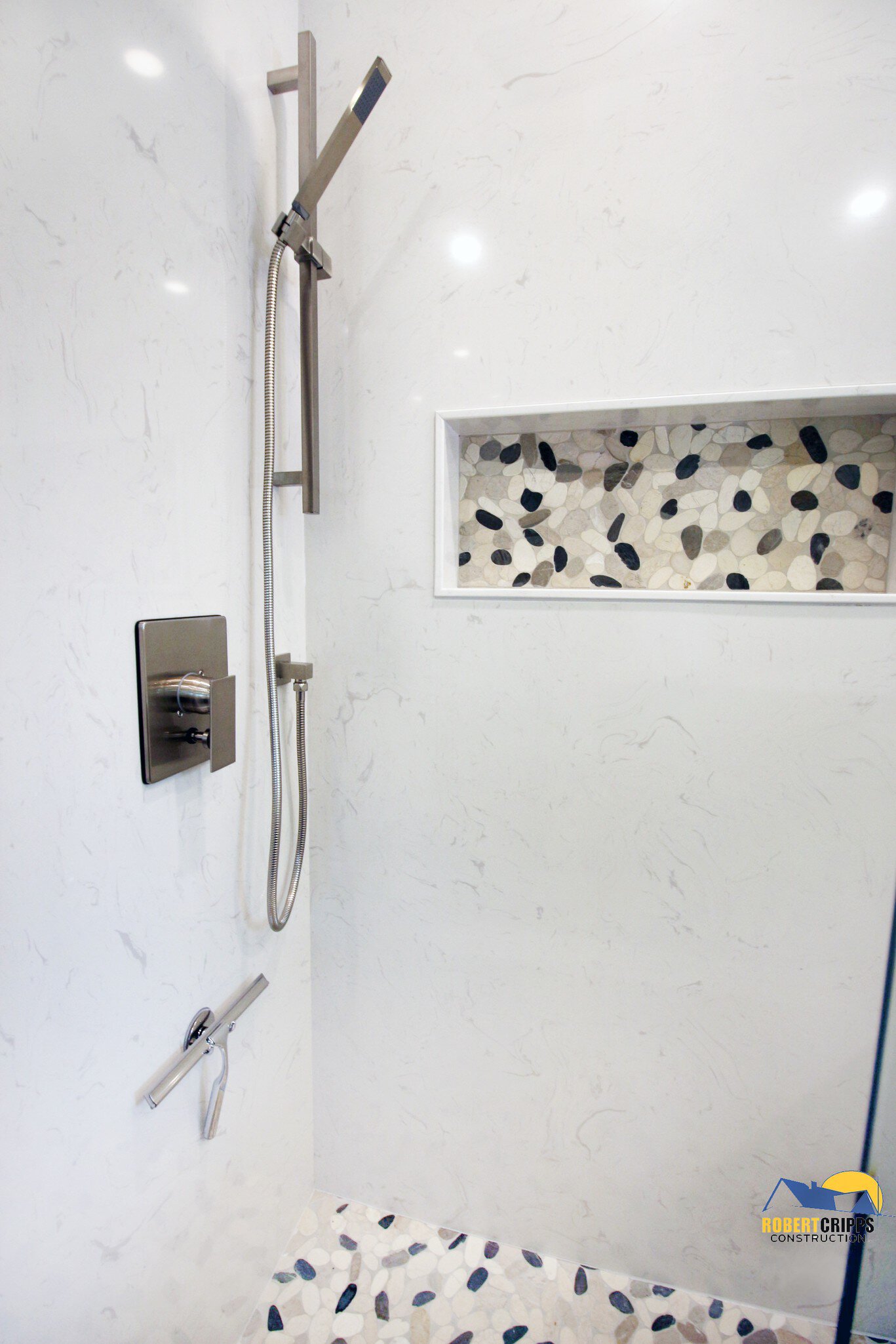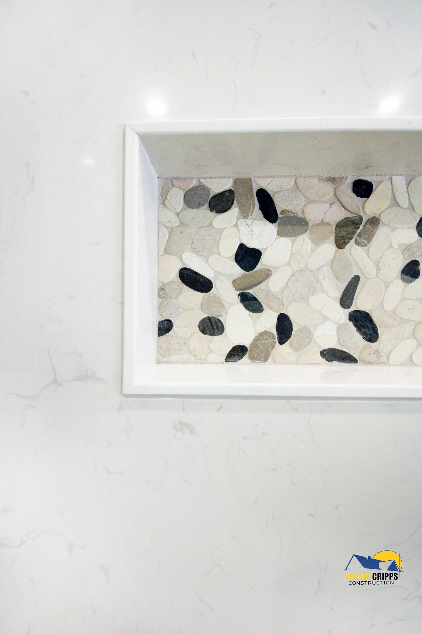 The complimenting river stone mosaic was placed on the KERDI-BOARD-SN niche making the area fully waterproof, vapor tight and ready to store your shower essentials.