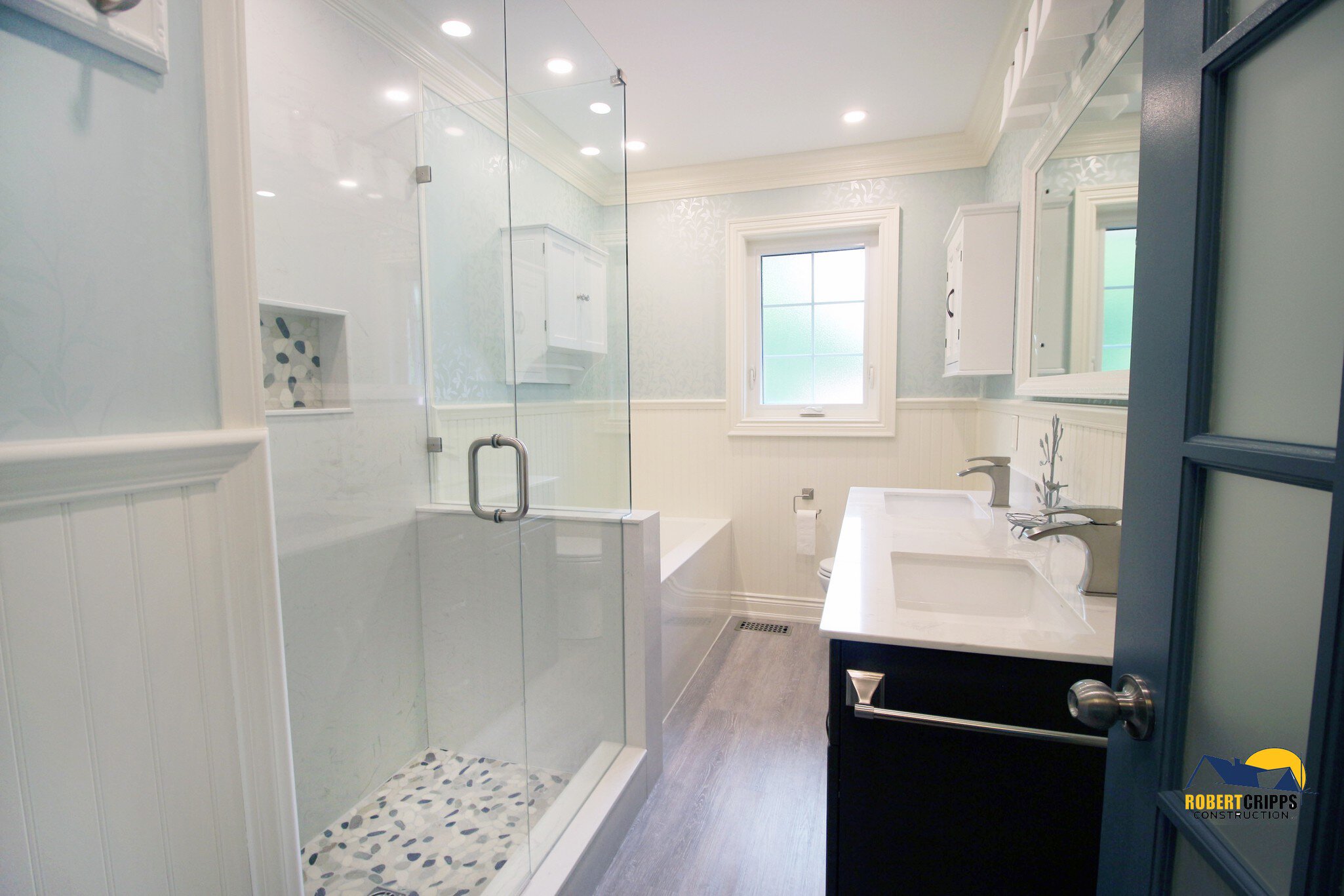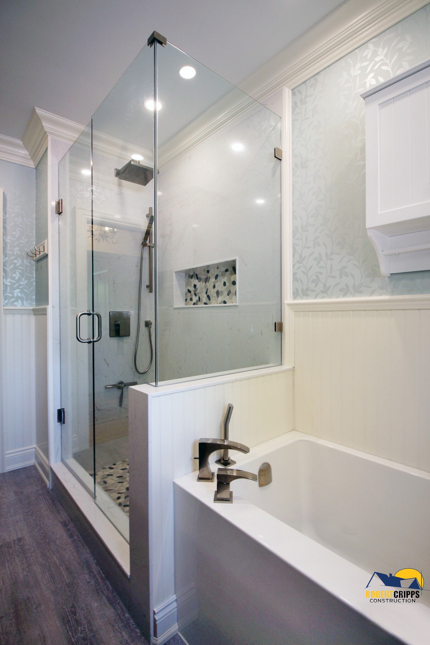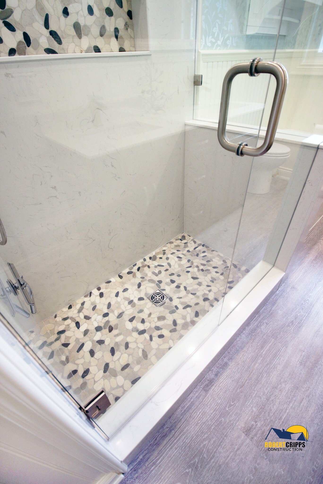 The complimenting river stone mosaic was placed on the KERDI-BOARD-SN niche making the area fully waterproof, vapor tight and ready to store your shower essentials.