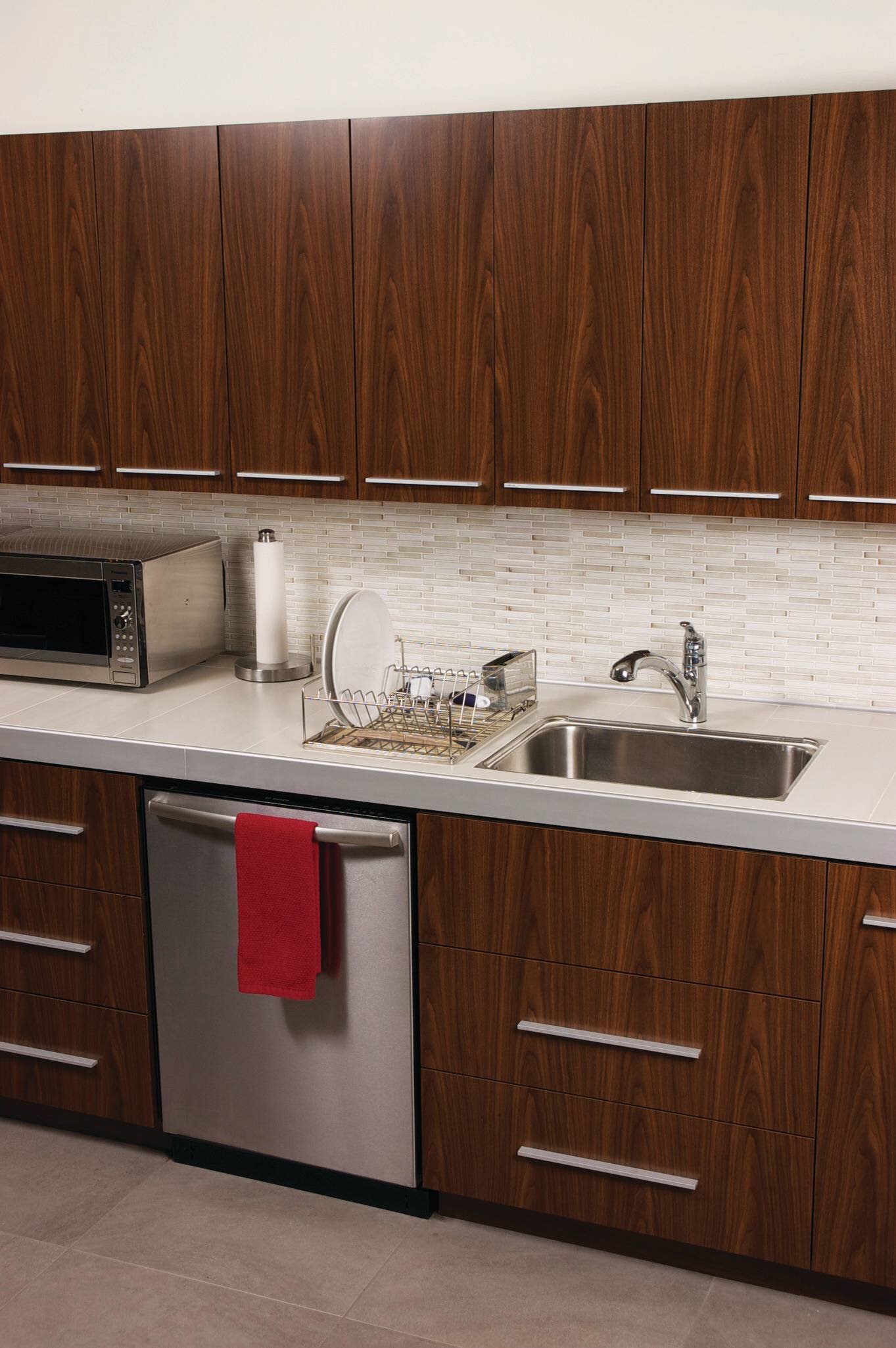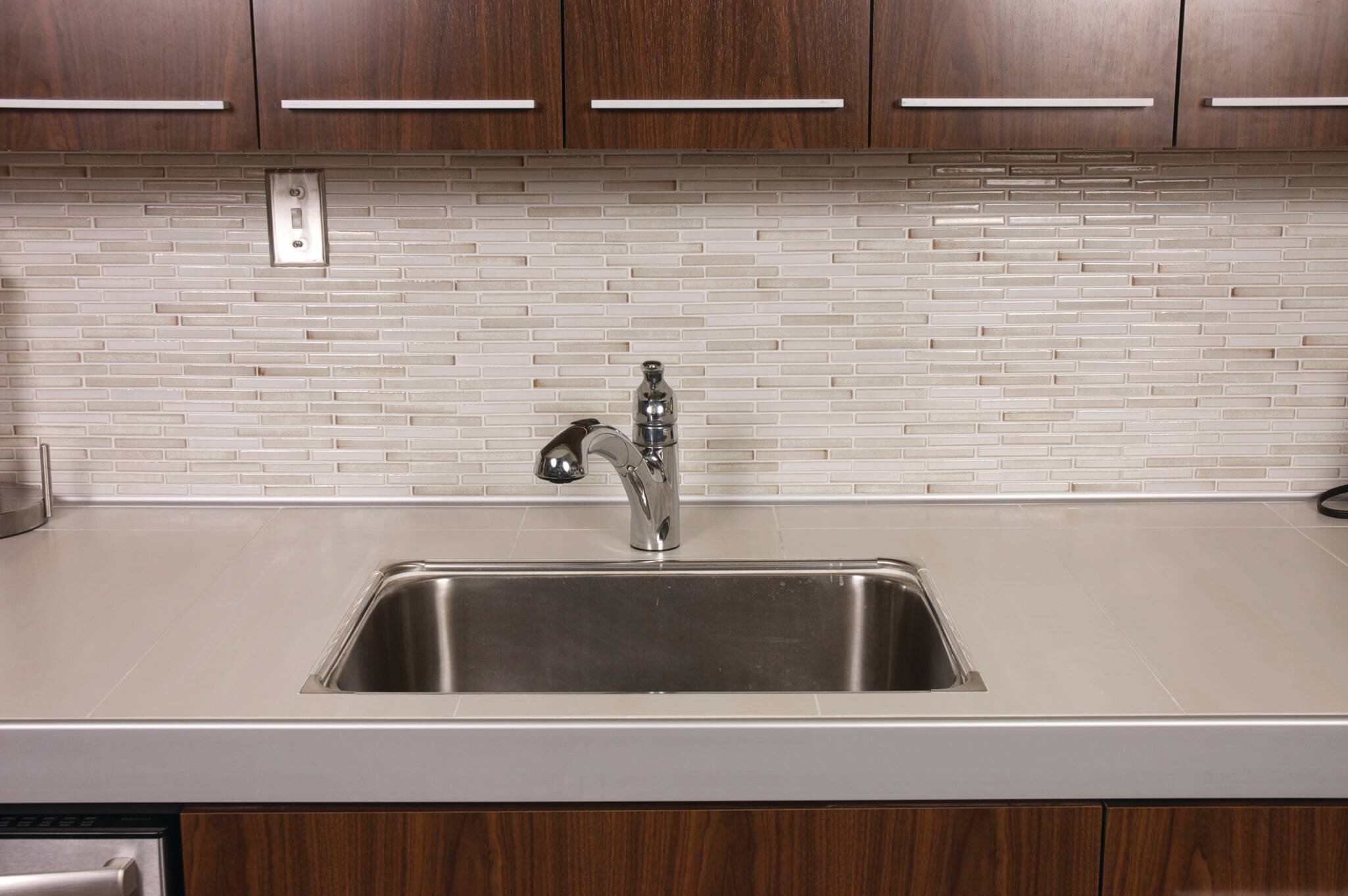 The satin anodized aluminum profile on the sink rail creates a bold, sleek finish in this modern kitchen design. Building a countertop with KERDI-BOARD is a breeze, with the RONDEC-STEP edging profile applied as the sink rail. RONDEC bullnose profile and large radius sink corners used to produce the tiled-under sink. DILEX-AHK cove-shaped profile used to create a smooth transition between the countertop and backsplash. With KERDI-BOARD as the backsplash substrate, the surface is perfectly even for tile installation and splash proof as well. DITRA is used as the flooring substrate, providing uncoupling and waterproof protection to the tiled floor.
