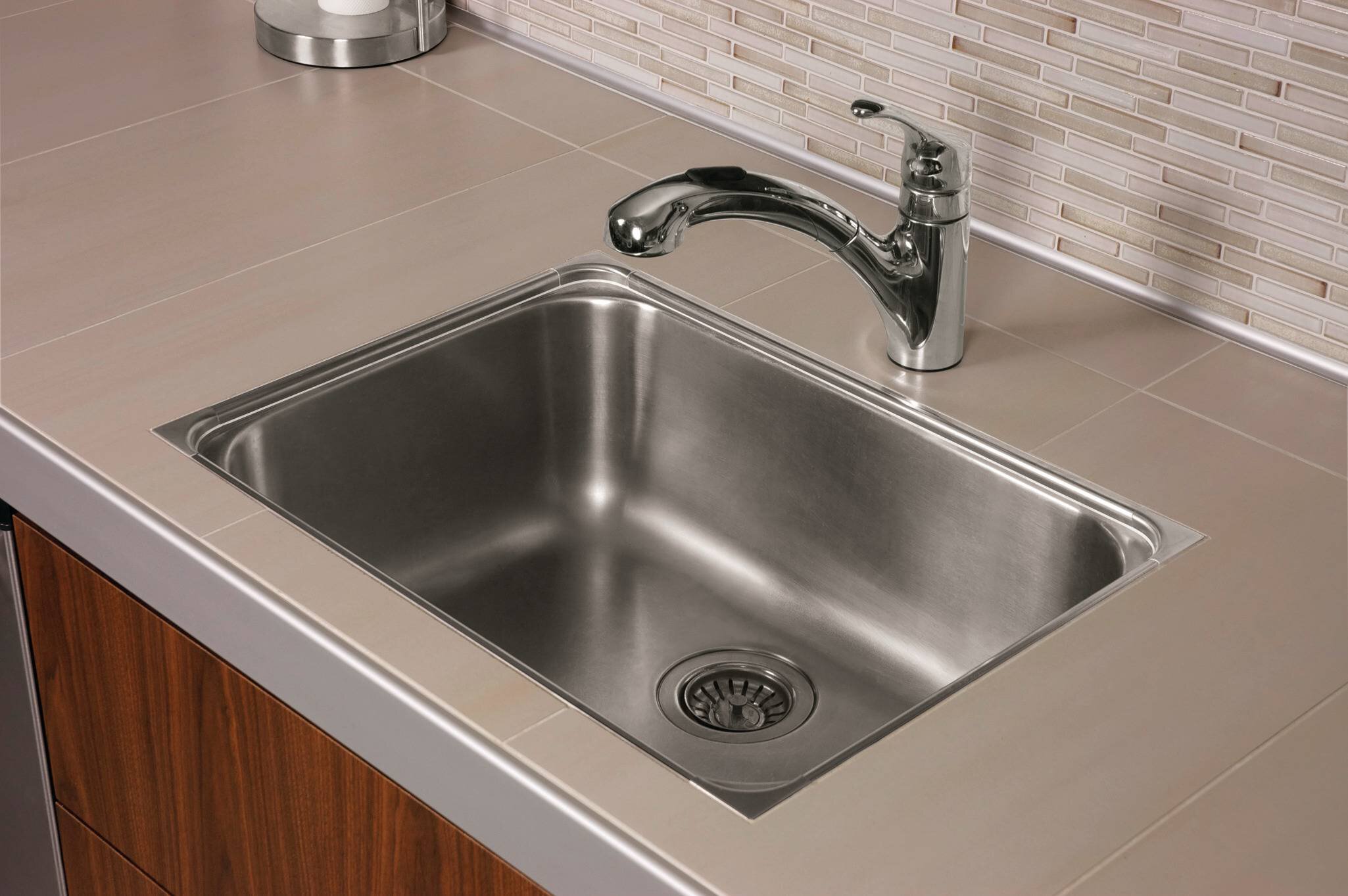 RONDEC-STEP edging profile applied to the sink rail. RONDEC bullnose profile and large radius sink corners used to produce the tiled-under sink. DILEX-AHK cove-shaped profile used to create a smooth transition between the countertop and backsplash. With KERDI-BOARD as the backsplash substrate the surface is perfectly even for tile installation and splash proof as well.