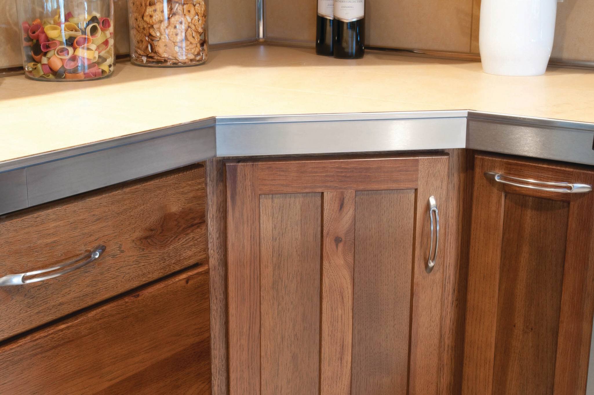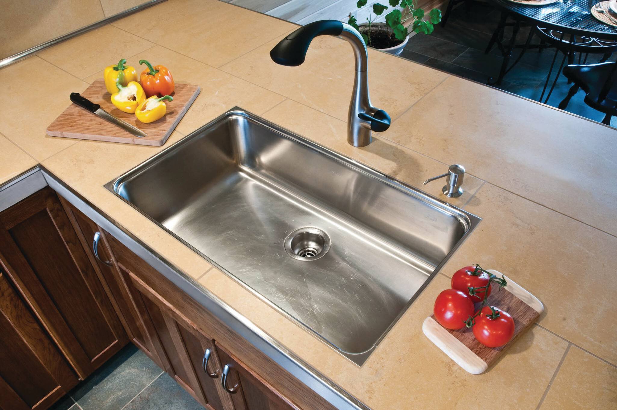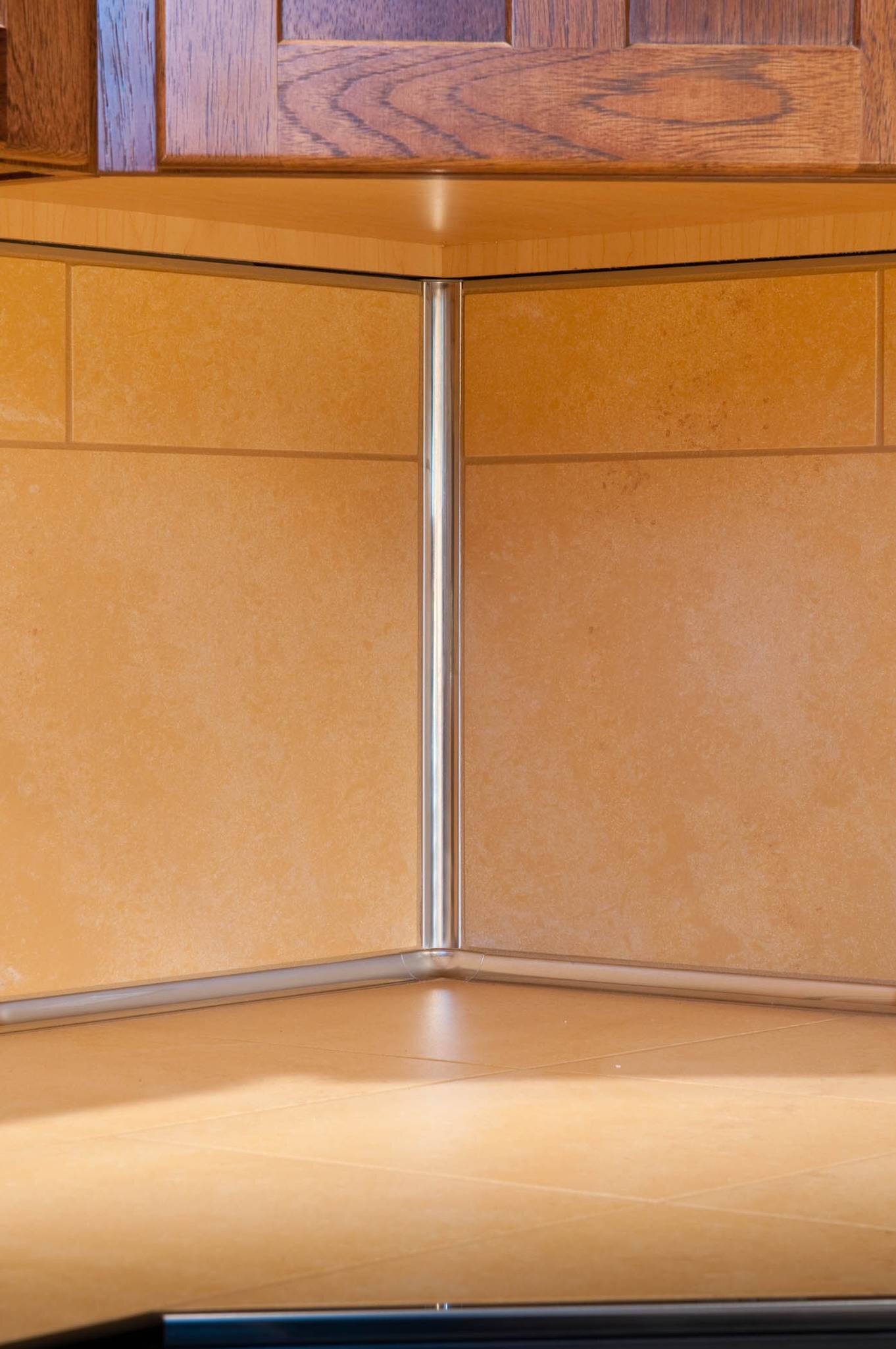 This kitchen countertop is constructed with KERDI-BOARD. The KERDI-BOARD-ZC brushed stainless steel U-shaped profile is used to cover the front face of the KERDI-BOARD panels. The QUADEC square-shaped profile in matching finish is used to finish and protect the edge of the tile. The RONDEC bullnose profile and sink corners used to produce the tiled-under sink.