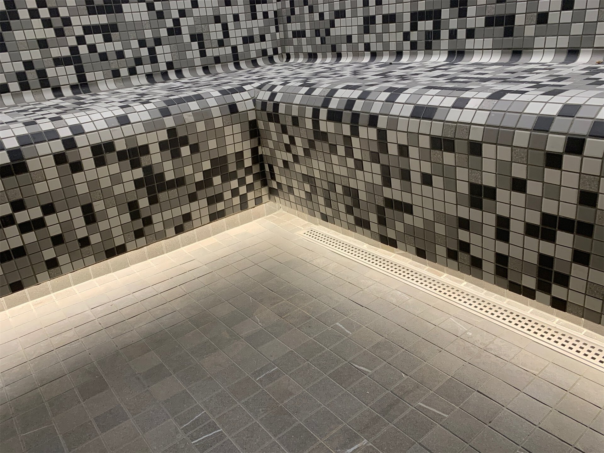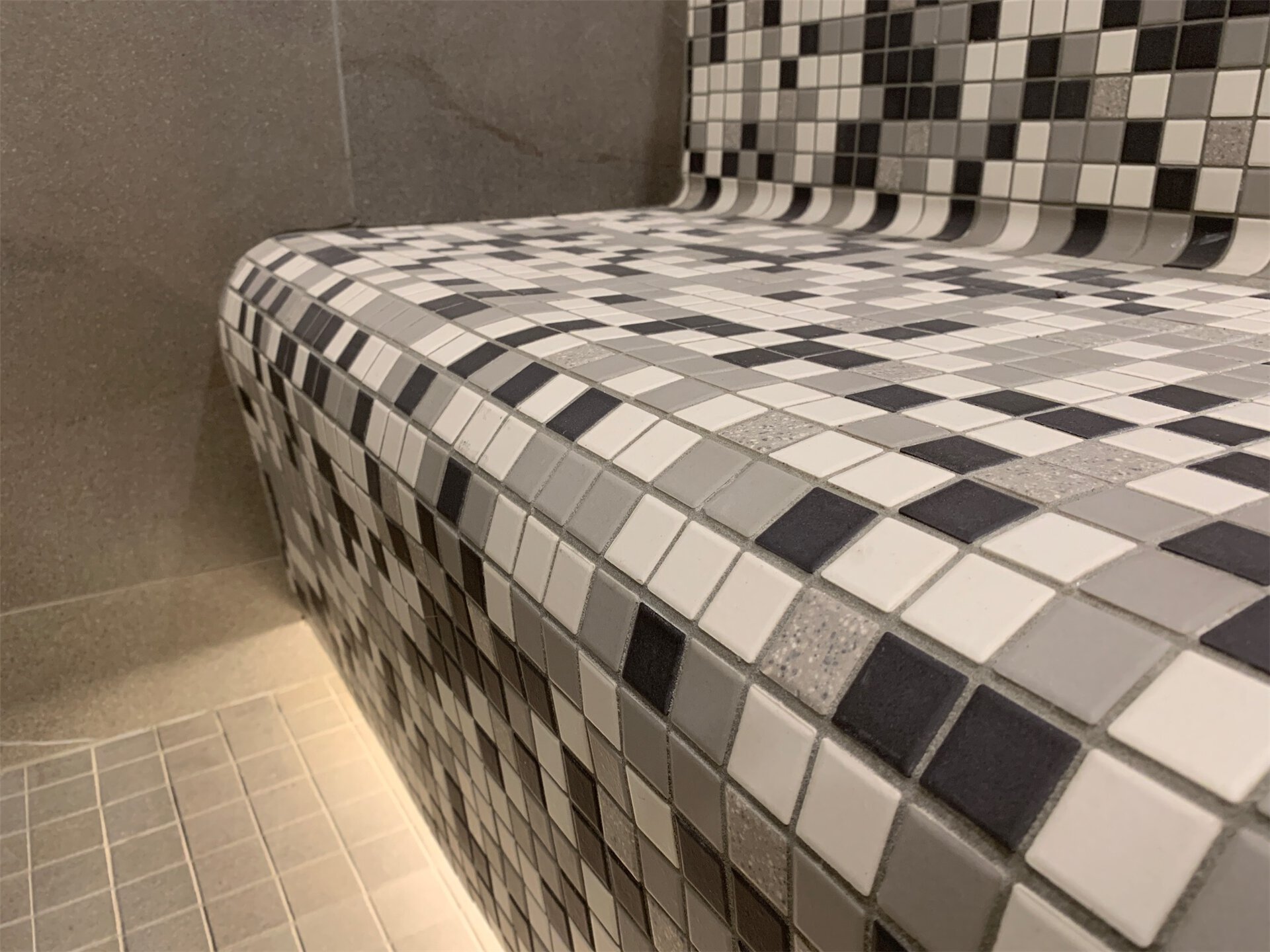 Schluter®-KERDI-BOARD-V vertically grooved building panels were used to create the three-tiered, waterfall bench. The curved edges of the three-tiered benches accommodate elegant mosaic tile while providing a comfortable seat. Schluter®- KERDI-DS bonded waterproofing membrane and vapor retarder was applied floor-to-ceiling.