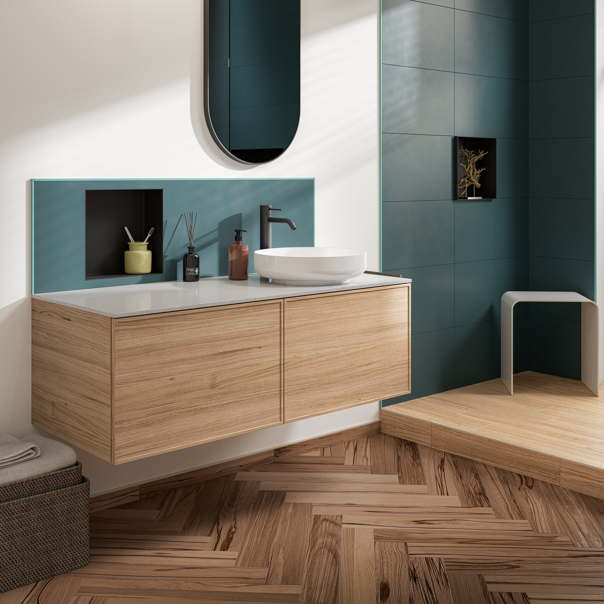 This modern bathroom blends warm wood tones with bold teal tile and four DESIGN-NICHE installations. Three are flush-mounted for a seamless look, while one near the shower features a reveal edge, creating a bold, framed effect. The matte black finish adds striking contrast to the vibrant tile.