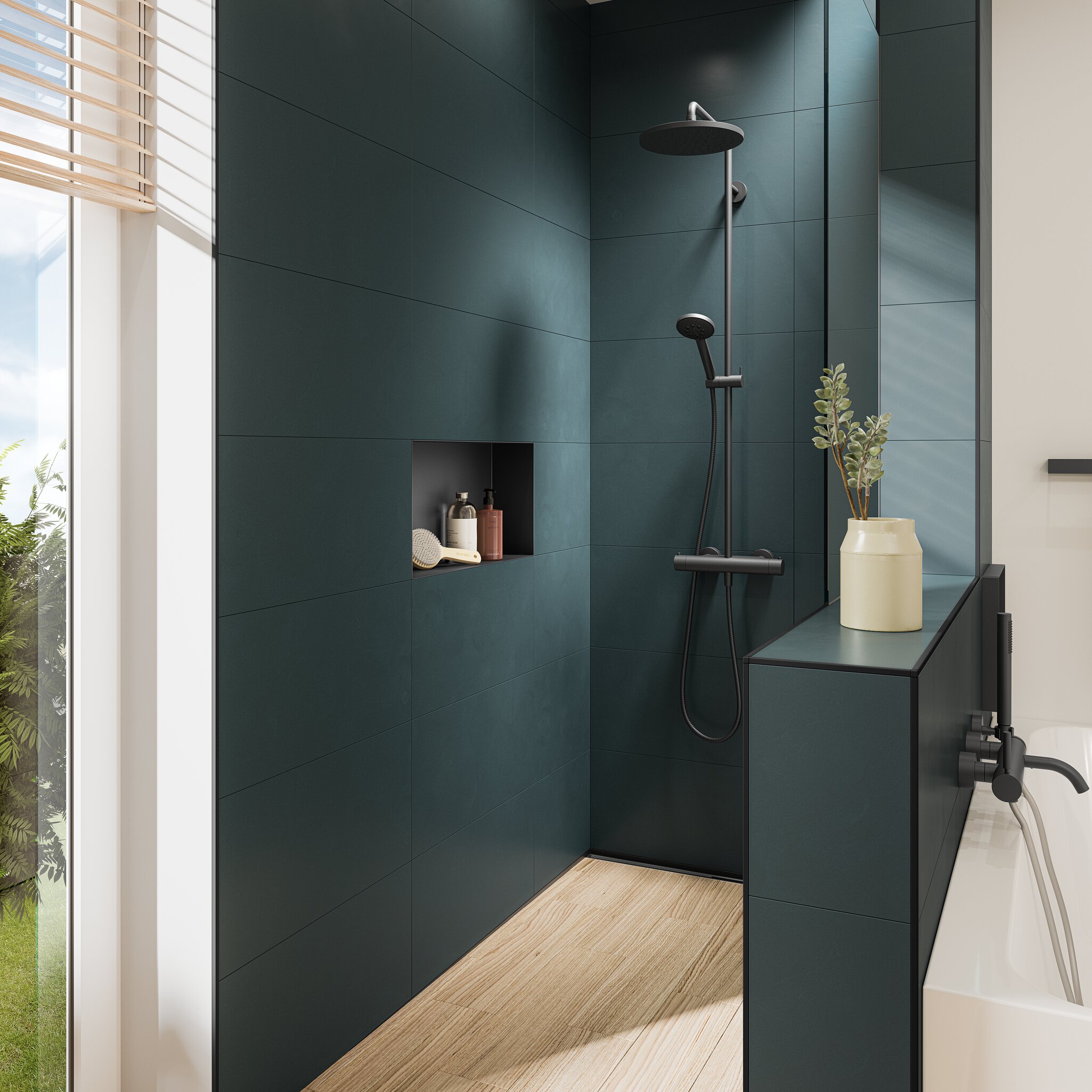 Inside the shower, a flush-installed DESIGN-NICHE integrates effortlessly into the teal tile, maintaining a clean and streamlined look. Paired with a matte black QUADEC profile that trims the tile, the niche ties together every design detail, proving that function and style can go hand in hand.