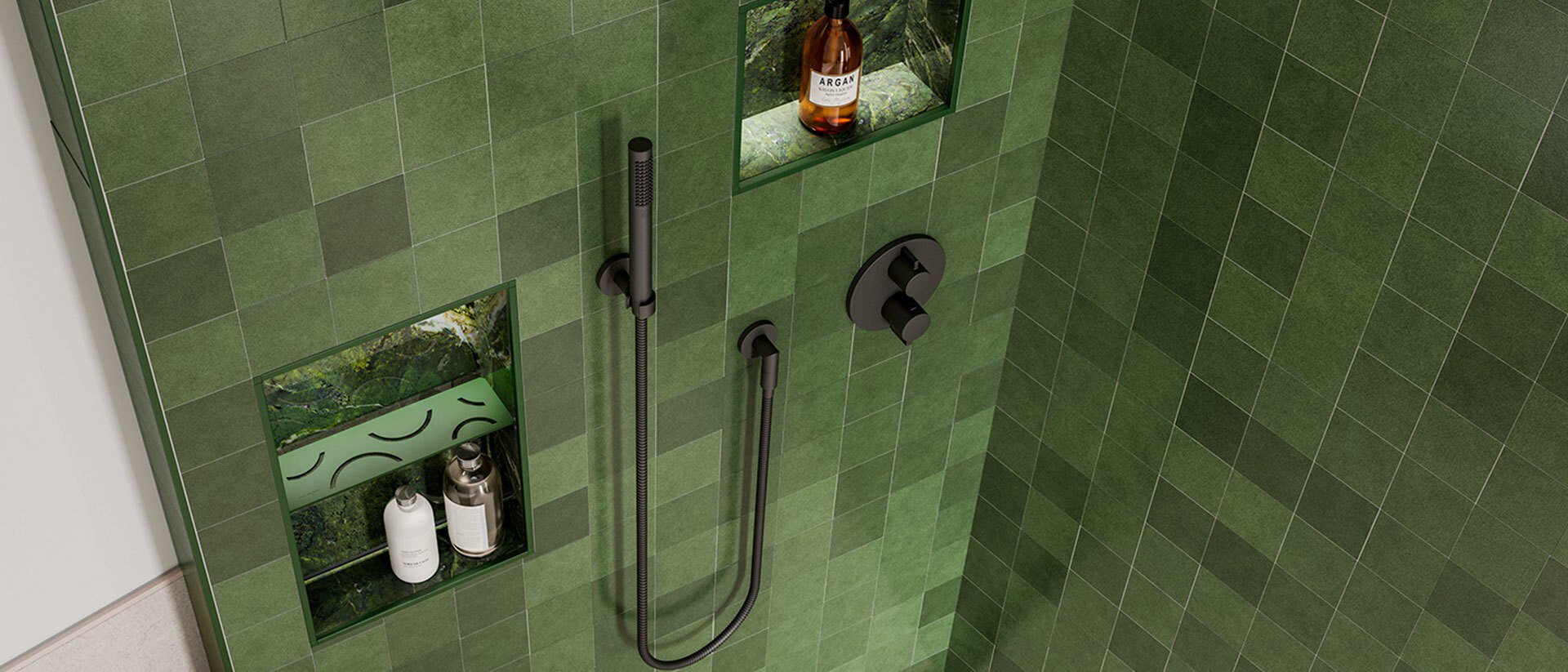 Beautiful shelves that are available in different shapes and designs provide valuable storage, now with the added benefit of custom color through MyDesign. Coordinate your shelves with surrounding profiles, tile, or brand colors for a cohesive and intentional finish.