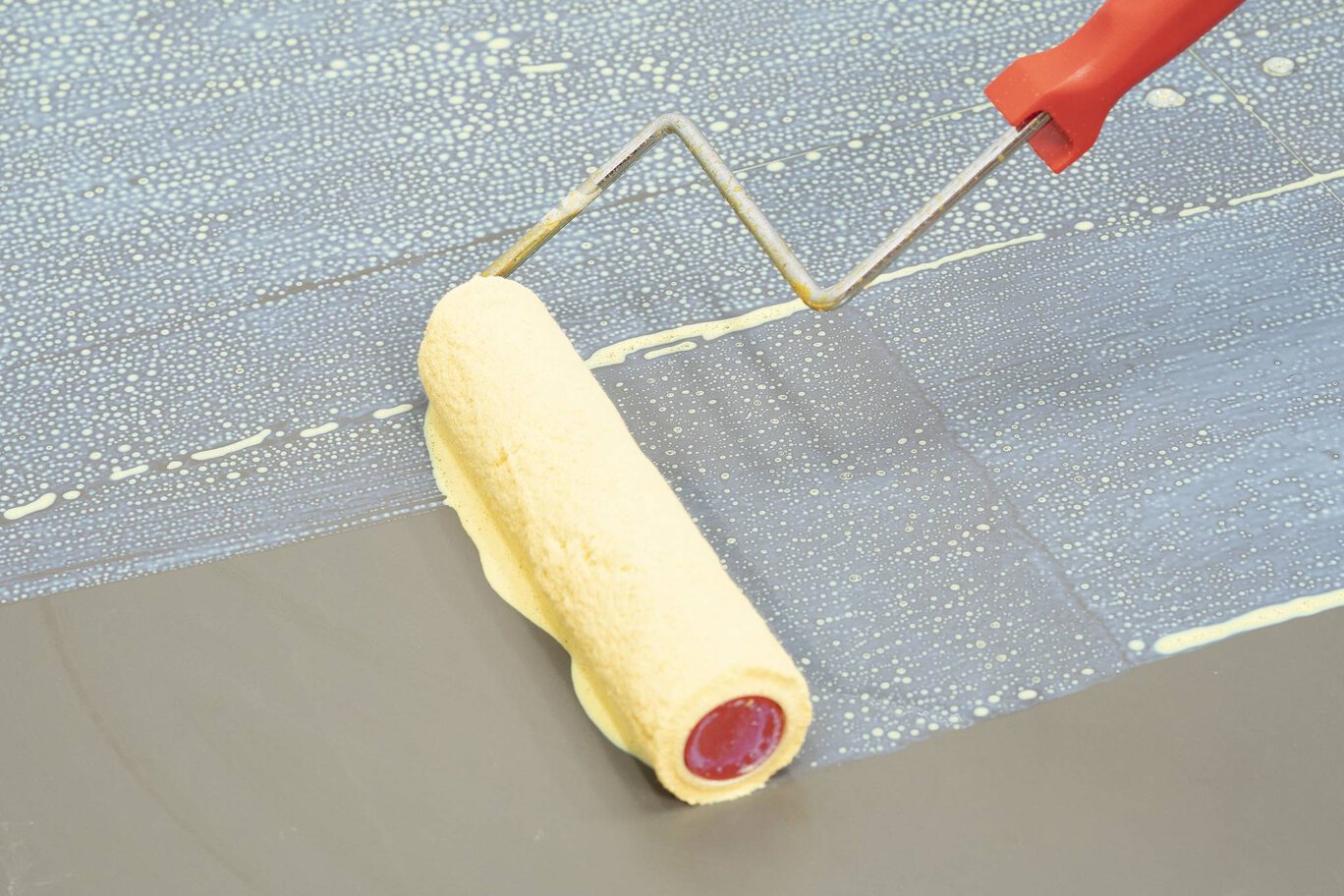 1. Aplique una capa fina y uniforme con un rodillo de pintura de 3/8" (10 mm) de punta media, o una brocha similar, pincel, esponja o pulverizador tipo jardín. Se recomienda utilizar un rodillo de espuma para substratos no porosos (por ejemplo, porcelana pulida, metal) y paredes. No deje puntos sin producto ni con cantidades excesivas de imprimación. Mantenga el rodillo húmedo durante todo el proceso de aplicación.