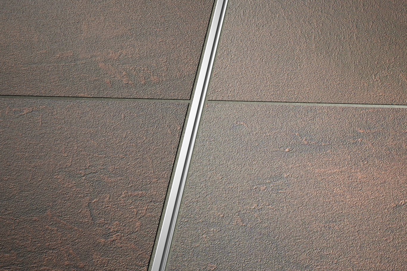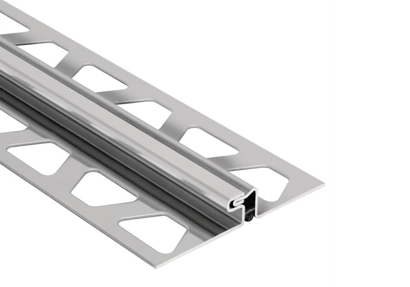 Schluter® DILEX-EDP es un perfil de junta de alta resistencia de acero inoxidable que protege los bordes de la baldosa y separa campos individuales en el revestimiento, ideal para áreas expuestas a un tráfico vehicular continuo.