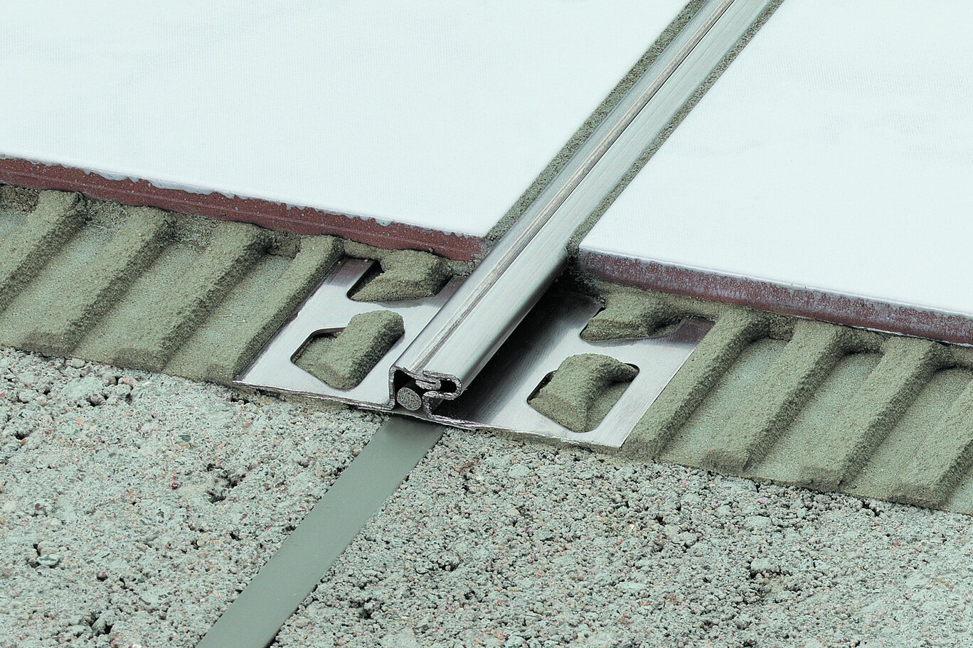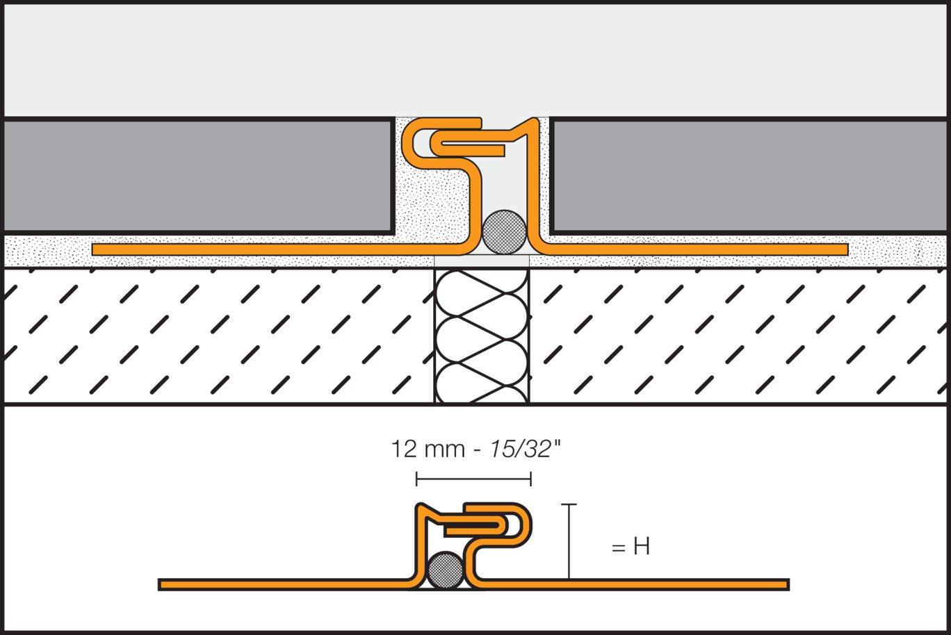 Schluter® DILEX-EDP dispone de alas de fijación de acero inoxidable perforadas en forma trapezoidal, las que se fijan en la capa de mortero adhesivo y protegen el borde de las baldosas adyacentes. El perfil separa campos individuales en el revestimiento y posibilita movimientos horizontales por medio de la conexión machihembrada, la que constituye también la superficie visible. Dado que el perfil está diseñado para absorber solamente movimientos horizontales, deben tomarse medidas apropiadas para prevenir que el recrecido se mueva verticalmente. En su posición de base, el ancho visible del perfil DILEX-EDP es 15/32" (32 mm). El perfil es particularmente adecuado para superficies revestidas de baldosas sujetas a un uso intensivo.