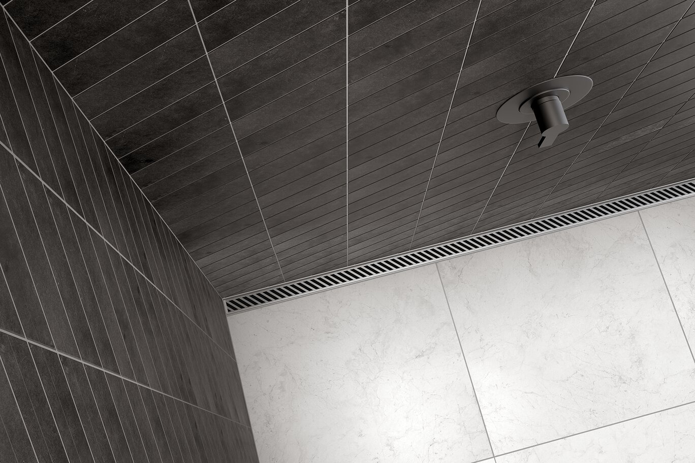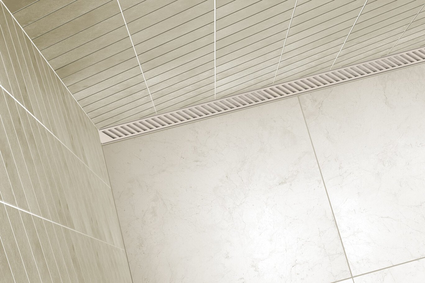 Schluter®-KERDI-LINE-VARIO es un drenaje lineal de bajo perfil y longitud variable para duchas diseñado específicamente para los ensamblados de impermeabilización pegados. KERDI-LINE-VARIO puede cortarse inicialmente a medida in situ para adaptarse a las dimensiones específicas de la ducha. El piso puede inclinarse en un solo plano hacia KERDI-LINE-VARIO, lo que permite utilizar baldosas de gran formato y crea interesantes oportunidades de diseño. KERDI-LINE-VARIO es más adecuado para su colocación contra la pared, pero también puede instalarse en el centro de la ducha. Para la colocación del drenaje en la entrada de la ducha, consulte la sección correspondiente al drenaje lineal KERDI-LINE.