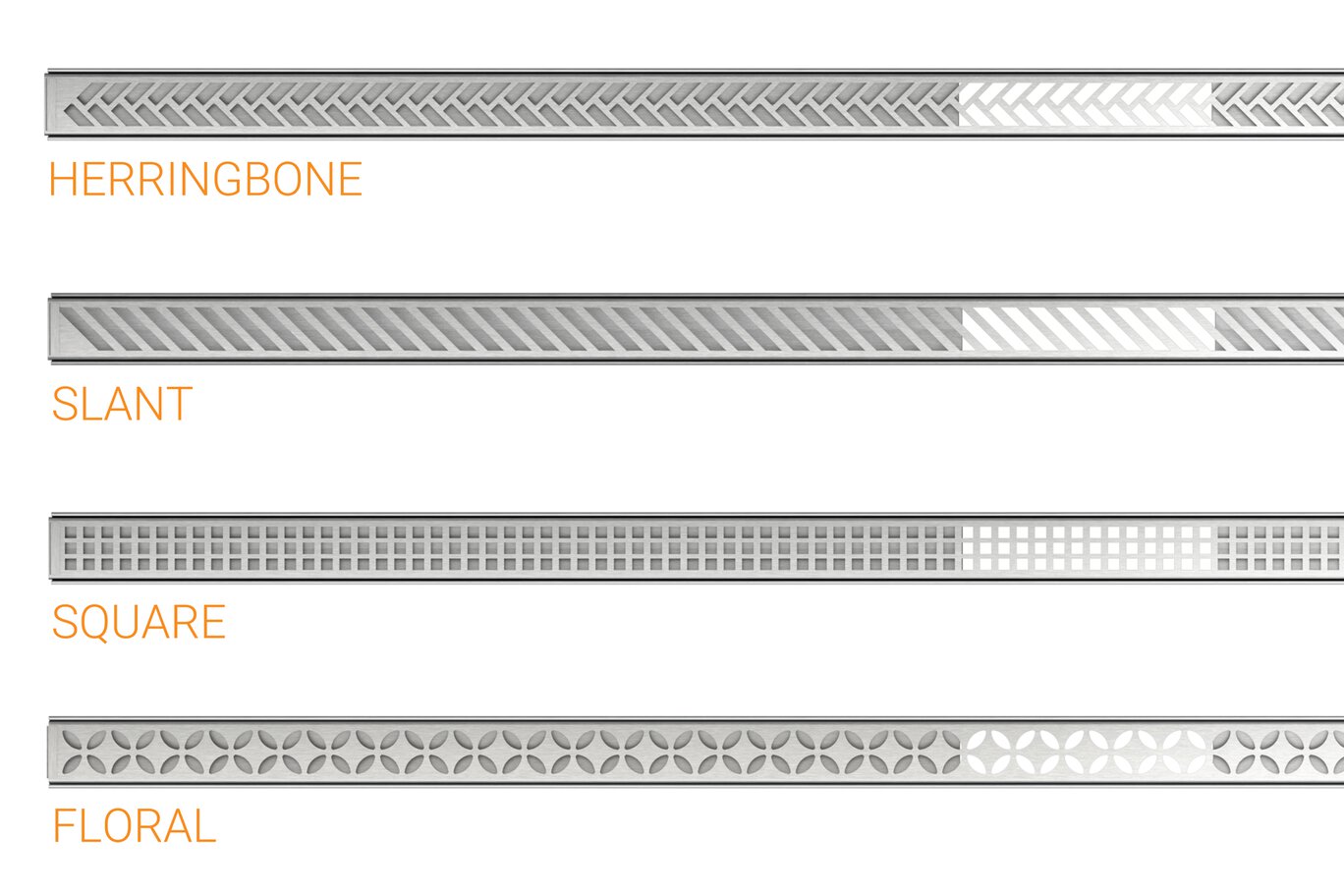 La rejilla KERDI-LINE-VARIO es un diseño de acero inoxidable conformado que se encaja en el canal correspondiente. La longitud total de la rejilla debe recortarse a la misma longitud que el canal. Si se recorta la rejilla, deben utilizarse los tapones terminales suministrados para proporcionar un aspecto de acabado limpio. El ensamblado de la rejilla KERDI-LINE-VARIO presenta un resalte mínimo tras la instalación y está disponible en cuatro diseños: SQUARE, FLORAL, HERRINGBONE y SLANT, en acabado de acero inoxidable cepillado (EB) o con revestimiento de color texturizado.