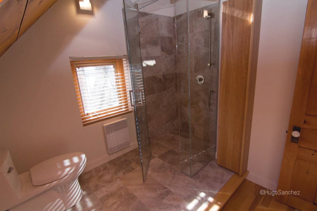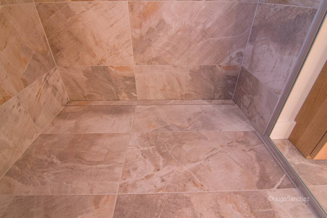 El drenaje lineal KERDI-LINE con la rejilla TILE se instala junto a la pared. Los pisos se inclinan en un solo plano hacia el drenaje lineal, permitiendo el uso de baldosas de gran formato.