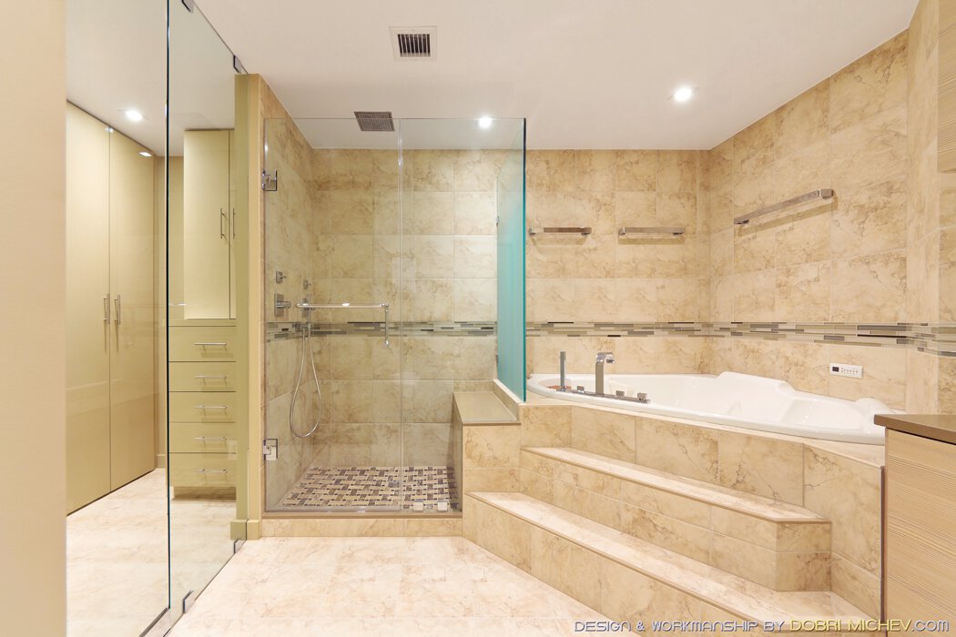 La creación de una base para una bañera de hidromasaje empotrada se simplifica utilizando KERDI-BOARD, a la vez que proporciona estabilidad e impermeabilización a medida de sus necesidades. Para impermeabilizar esta sala de baño se ha utilizado KERDI y DITRA junto con KERDI-BAND.