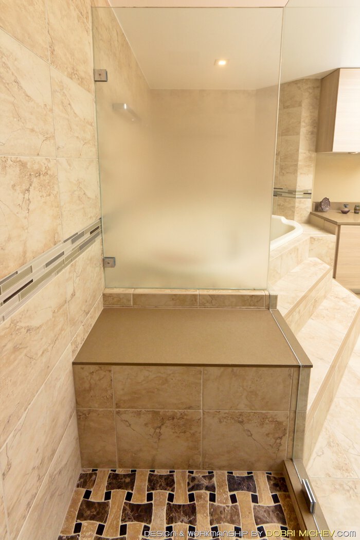 KERDI-BOARD se utilizó para personalizar un gran banco de asiento que ocupa todo el ancho de esta ducha, maximizando el espacio disponible.